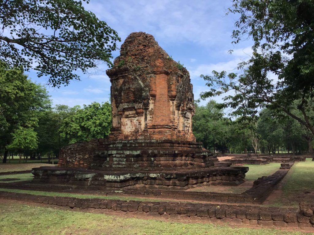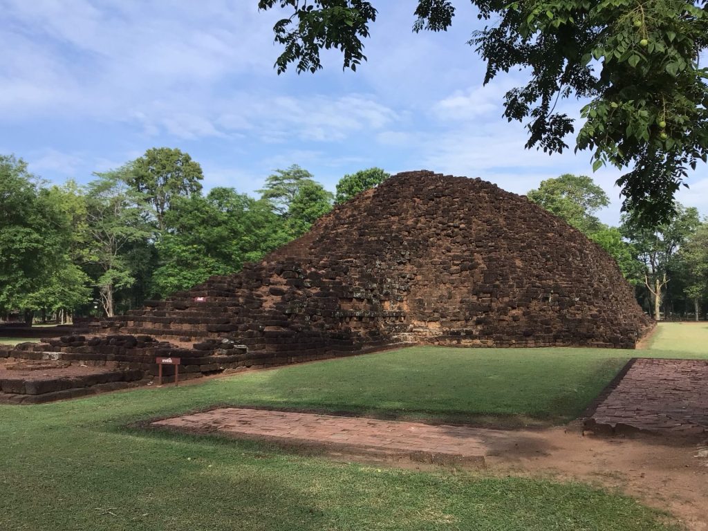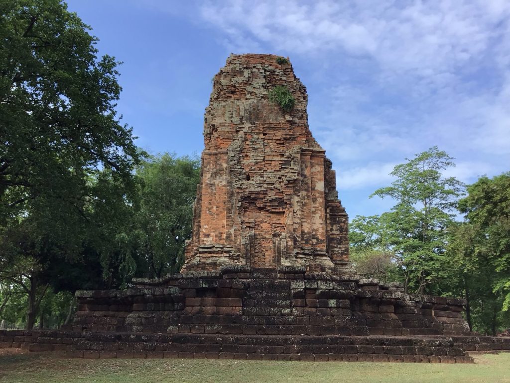 Après avoir parcouru une petite trentaine de kms, j’arrive à l’entrée du Si Thep Historical Park. Cette ville historique datant du XIé siècle était constituée de deux parties jointes couvrant environ 4,7 km2. La partie la plus interne de la ville (Muang Nai), qui couvre 2,08 km2, était entourée de murs et de douves, disposés en cercles presque concentriques, donnant à la ville un diamètre d’à peu près 1,5 km. La partie intérieure de la ville est parsemée de 70 étangs. Cette partie inclut 3 monuments importants (le Prang Sithep, le Prang Song Phi Nong et le Khao Khlang Nai), et environ 45 sites archéologiques, tous restaurés par le Fine Arts Department de Thaïlande. La partie externe de la ville (Muang Nok) est en rectangle avec des coins arrondis, couvre 2,54 km2, est entourée de murs et douves et comporte des monuments en ruines, à la suite des pillages et réutilisations successives des matériaux.