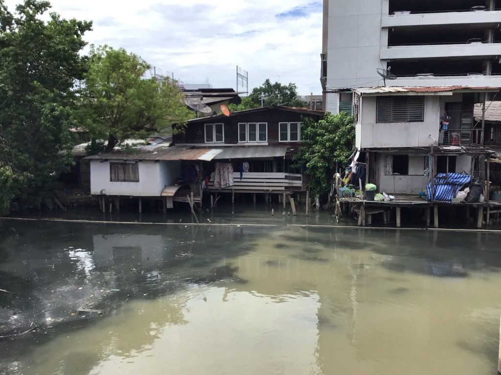 J’emprunte à présent un cheminement en béton qui passe au milieu d’un bidonville en bordure de ce canal qui est devenu un égout à ciel ouvert. L’odeur est nauséabonde. Pourtant des gens vivent ici dans de pauvres cabanes. Malgré quelques fleurs et arbres, c’est du misère difficilement supportable. Je me souviens d’ailleurs de mon arrivée en train à Bangkok et de ces taudis au bord des rails.