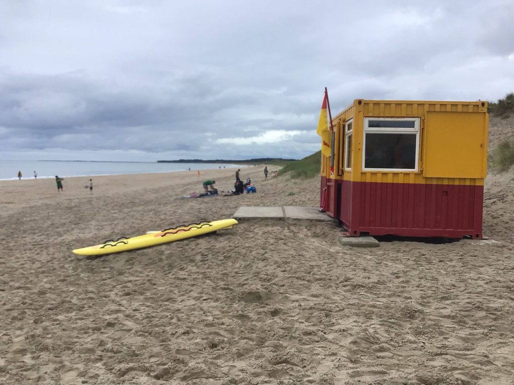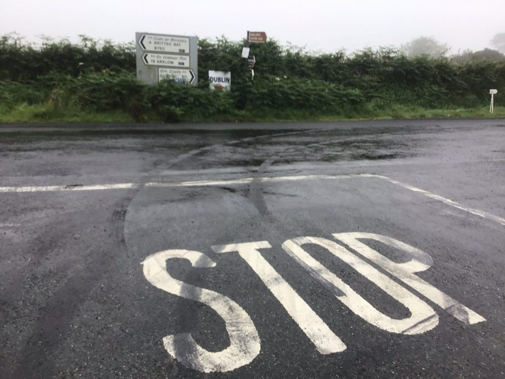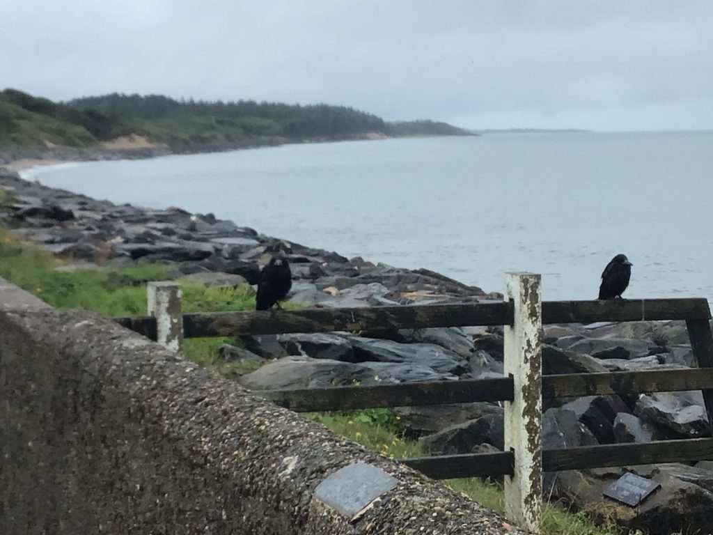 Vers 9h30, je m’arrête à Arklow, première ville côtière traversée depuis mon départ. Je reprends mes habitudes de pause-café / cookie et en profite pour recharger mes appareils, profiter de la Wi-Fi et écrire ces lignes. Une heure plus tard, je reprends la route du sud mais toujours sous la pluie. Par contre, la route côtière ne longe pas la côte mais reste dans les terres. Dommage … Finalement, je rejoins la mer à Courtown, charmant petite station balnéaire avec sa belle plage de sable. Mais, vu les conditions météo, même les corbeaux locaux tirent la gueule.