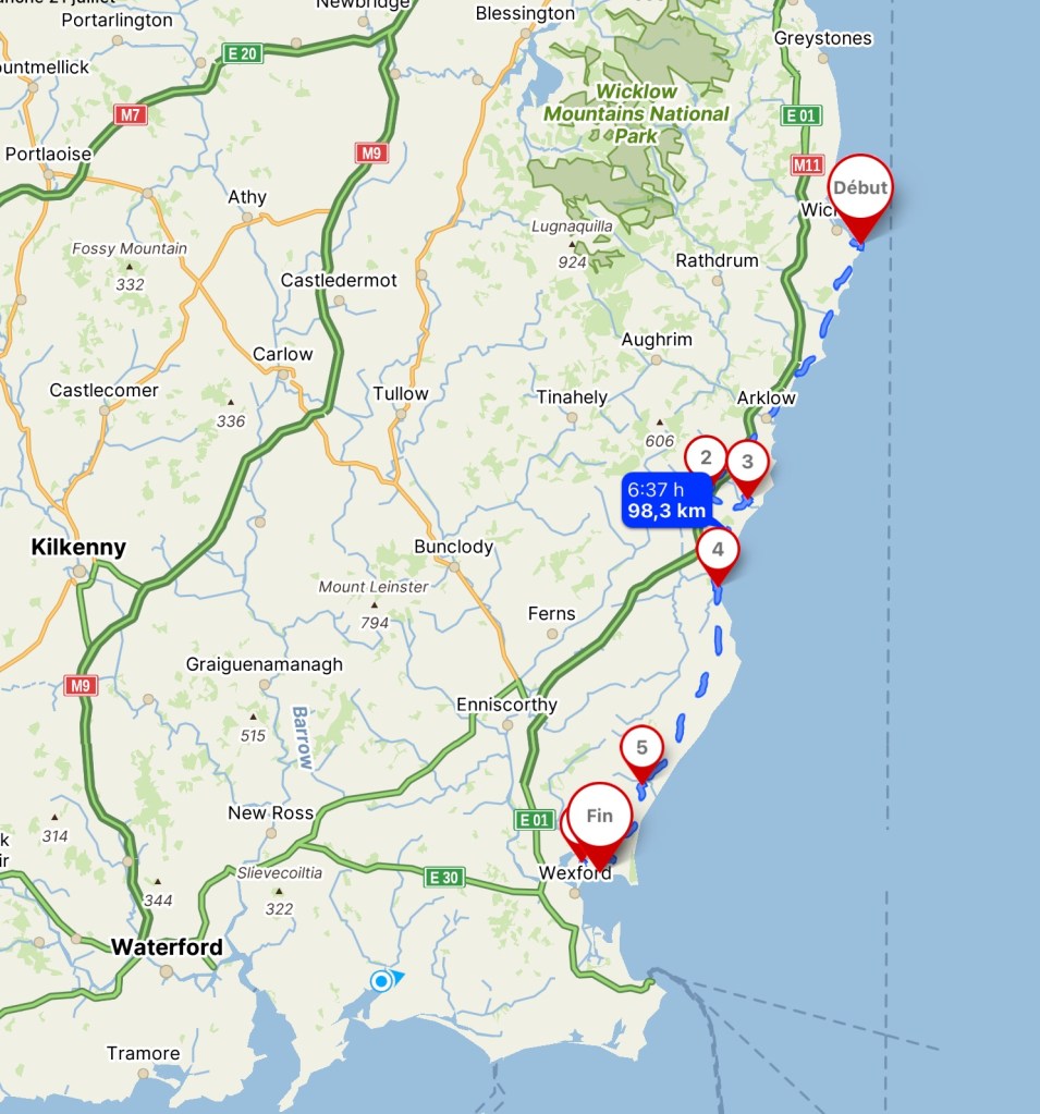 A ce sujet, une pensée pour mes ami.es de L’Arche-en-Pays-Toulousain. Je ne sais pas qui fait le marché ce matin. Je pense que la météo doit être un peu plus clémente. Avant que je n’oublie, je publie la carte de l’Irlande. Je suis donc en train de descendre la côte est depuis Dublin et vais la suivre le plus longtemps possible avant mon retour.