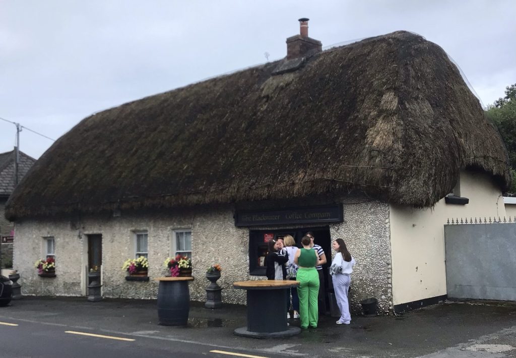 La route repart à nouveau dans les terres à un ou deux kms de la mer. En ce début d’après-midi, la circulation devient plus dense. Je serre les fesses vu l’étroitesse de la route. Mais les irlandais semblent respectueux de la distance de sécurité et ne me doublent que lorsque la visibilité est bonne. Arrivé à Blackwater, j’immortalise ma première chaumière irlandaise au toit de chaume. Devant, une jeune femme est aux couleurs du pays : vert ! Je comprends pourquoi on surnomme l’Irlande la « Verte Erin ».