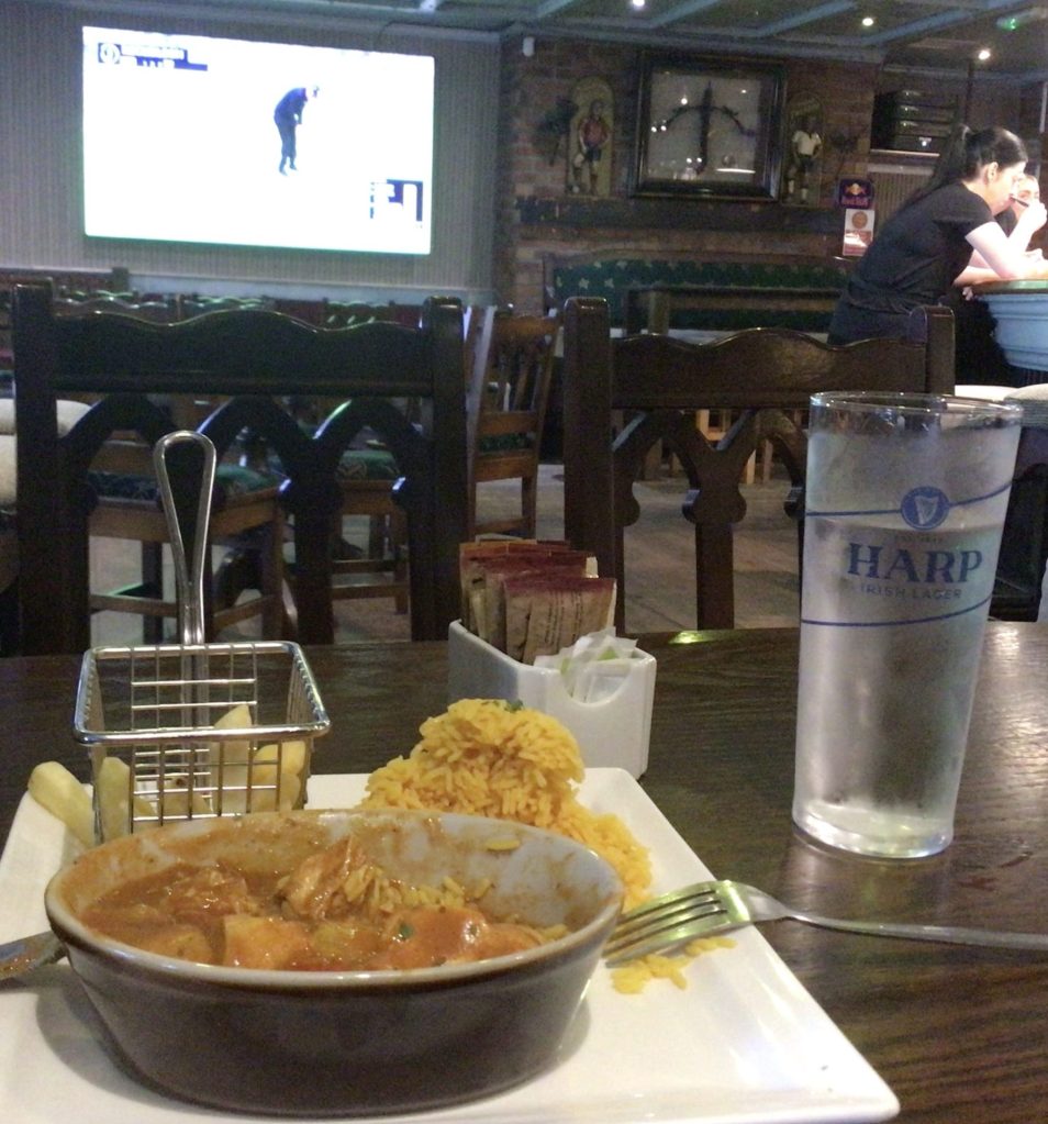 Je dégote un restau qui ne donne pas sur le front de mer. Il est un peu plus de midi et les serveuses attendent le client. Je serais le premier. J’ai les crocs. Je me commande un poulet curry servi avec des frites et du riz que je dévore devant une compèt’ de golf. Avec ça dans le ventre, je devrais tenir un moment surtout que la route est toujours aussi accidentée.