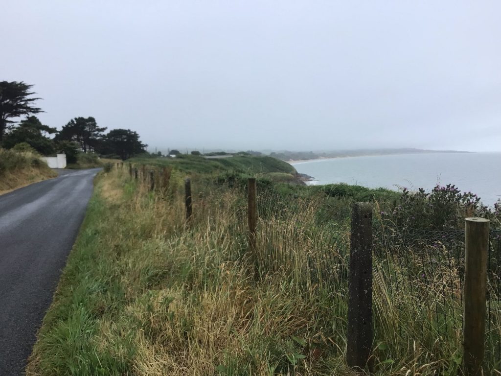 Le ciel est bas. Il se confond à nouveau avec l’océan bien calme ce matin. Hier, le fort vend de sud chassait les nuages. Là, j’en ai pour la journée. La température est agréable pour pédaler. Il doit faire un petit 20°c. Par contre, le crachin ne cesse pas. J’ai donc sorti ma tenue de marin-pêcheur (ciré jaune et gant Mapa). Ainsi, je suis bien visible et protégé. Quant aux jambes et pieds, ils sont mouillés ! Les paysages sont ô combien sauvages. Je me régale les yeux. La route côtière serpente le long d’une côte parfois sablonneuse mais souvent déchiquetée. Il n’y a pratiquement personne en ce samedi matin.