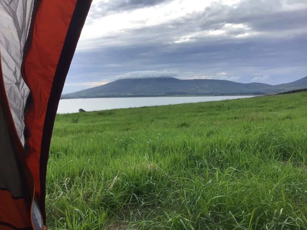 Il me faut ensuite remonter la longue pente à travers une forêt luxuriante mais humide et froide aussi. Puis je retrouve la route principale et reprends mon cheminement pour finir le tour de cette pointe de Uíbh Ráthach dont le sommet Carrauntoohil culmine à 1.038 mètres quand même ! De la route, la vue est sympa sur mon dernier bivouac.