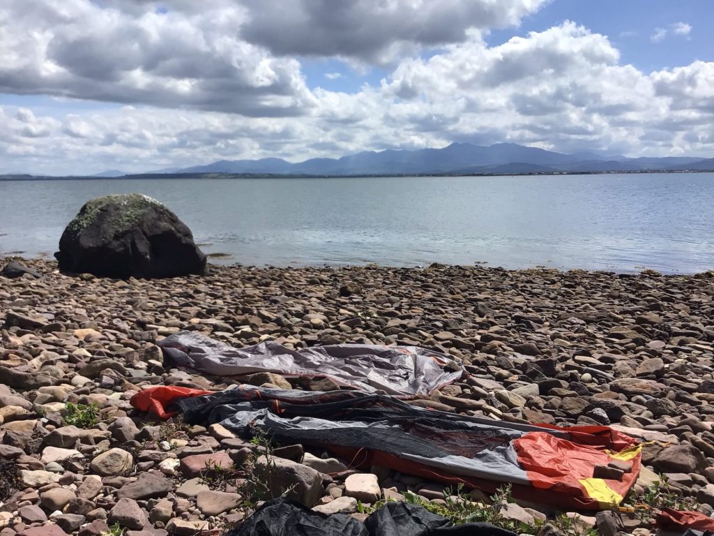 A nouveau réveillé vers 5h30 par l’humidité et le froid matinaux. Je me sors du duvet vers 6h30 avant de tout plier. Puis, je vais sur la plage faire ma séance de Qi Qong les pieds nus dans le sable froid. Goods Vibrations ! Je m’installe ensuite au soleil pour prendre mon p’tit déj’.