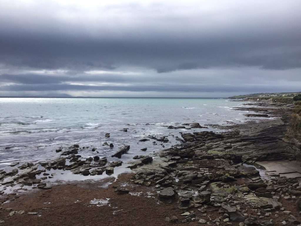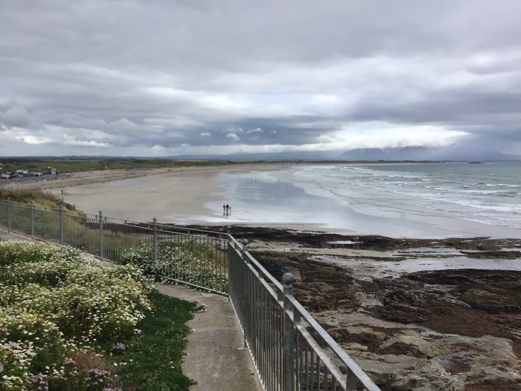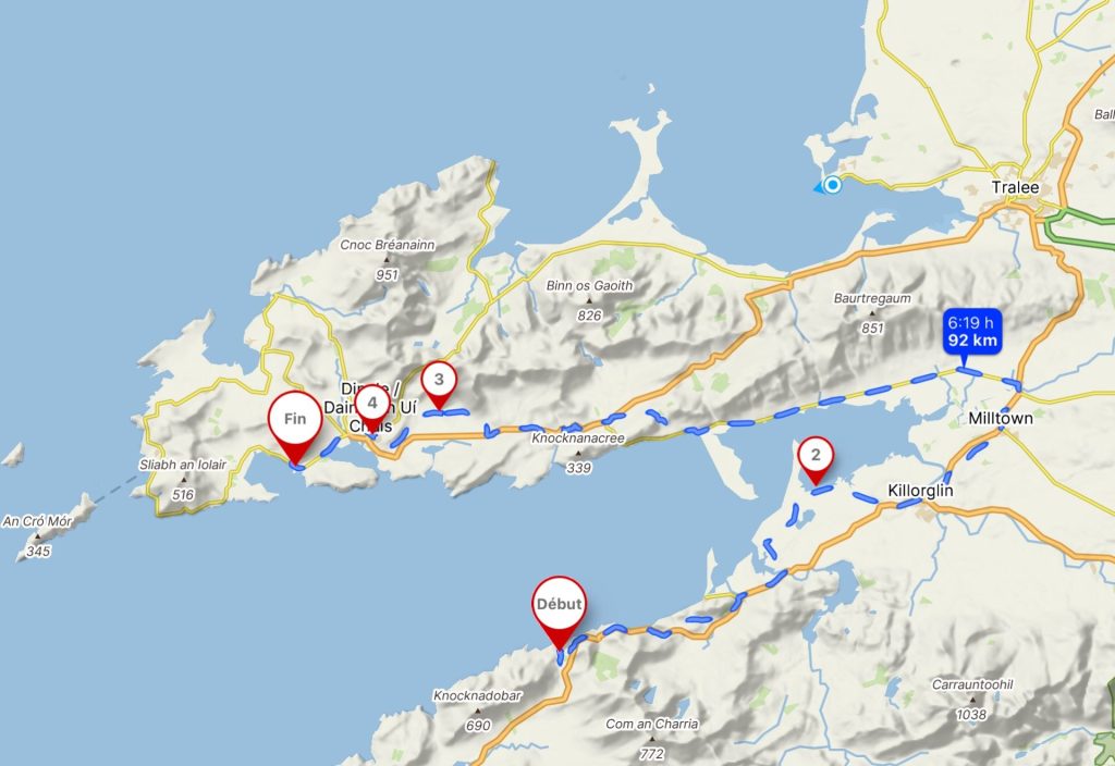 Je poursuis mon chemin en suivant toujours The North Kerry Cycleway qui me permet d’emprunter de charmantes routes à travers la campagne avant de retrouver la route régionale R551 toujours moins sympathique. Vent dans le dos, je file bon train entre 25 et 30km/h pour arriver vers 16h00 à Ballyheigue. Je m’y arrête faire quelques emplettes dans le magasin Centra Du coin. Puis je vais en bord de mer admirer le spectacle. Côté sud, c’est plage de sable blanc à marée basse, où quelques fadas se baignent encore, avec la péninsule de Corca Dhuibhne.