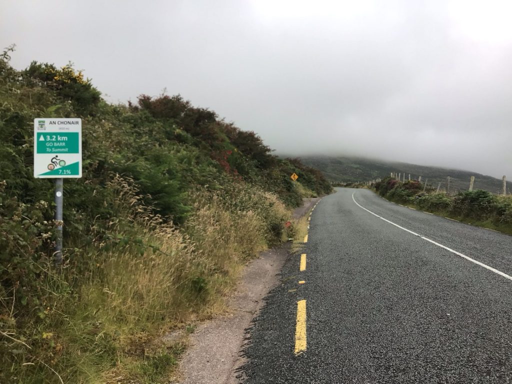 Finalement, vu la météo, je zappe la boucle autour de la pointe qui me faisait revenir sur cette ville. Je m’échauffe avant d’attaquer le gros morceau de la journée. Je vais emprunter la R560 qui rejoint la côte au nord. Et je vais devoir grimper un col à 460 mètres d’altitude juste en dessous du An Bhinn Dubh à 479m. En sortant de Dingle, je rate l’embranchement et tire tout droit pour me retrouver sur un chemin balisé.