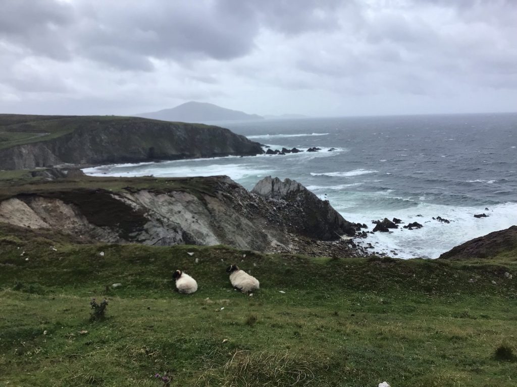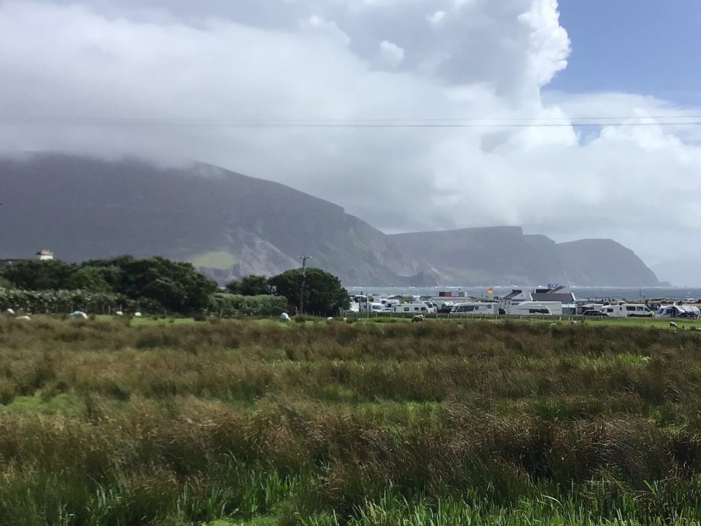 Une fois en avoir pris pleins les mirettes et les narines, je rentre dans la terre où je rejoins la route régionale R319. Et là, ça devient beaucoup moins sympa. Ça circule beaucoup sur cet axe. C’est surprenant car cette route est un cul de sac qui va sur la pointe extrême ouest de cette île et de l’Irlande du nord par la même occasion. Par contre, il est plus de 13h et j’ai les crocs avec toutes ces émotions. Las. Le seul restau de Bun an Churraigh, petit village dans les terres est fermé ce jour. Je poursuis donc ma route jusqu’à Keel. Je comprends pourquoi il y avait de la circulation. C’est un méga spot de kite-surf. Le camping est blindé. C’est le Gruissan local ! Vers 14h, je trouve enfin un endroit où me restaurer. Pas contre, toujours pas de wifi.