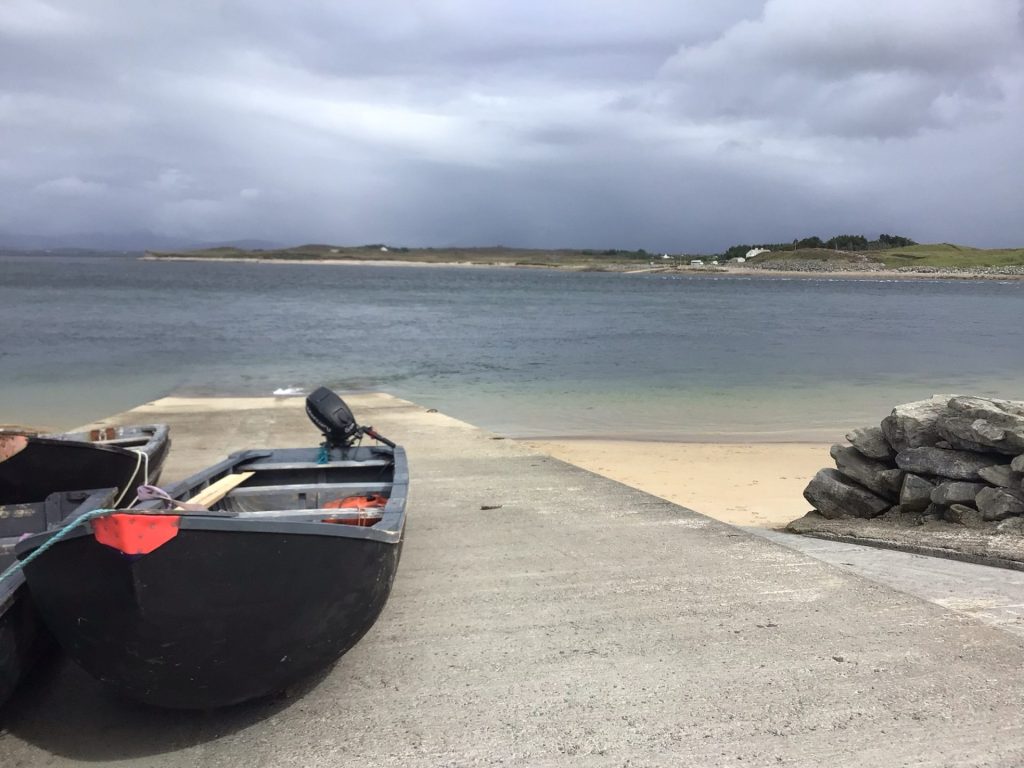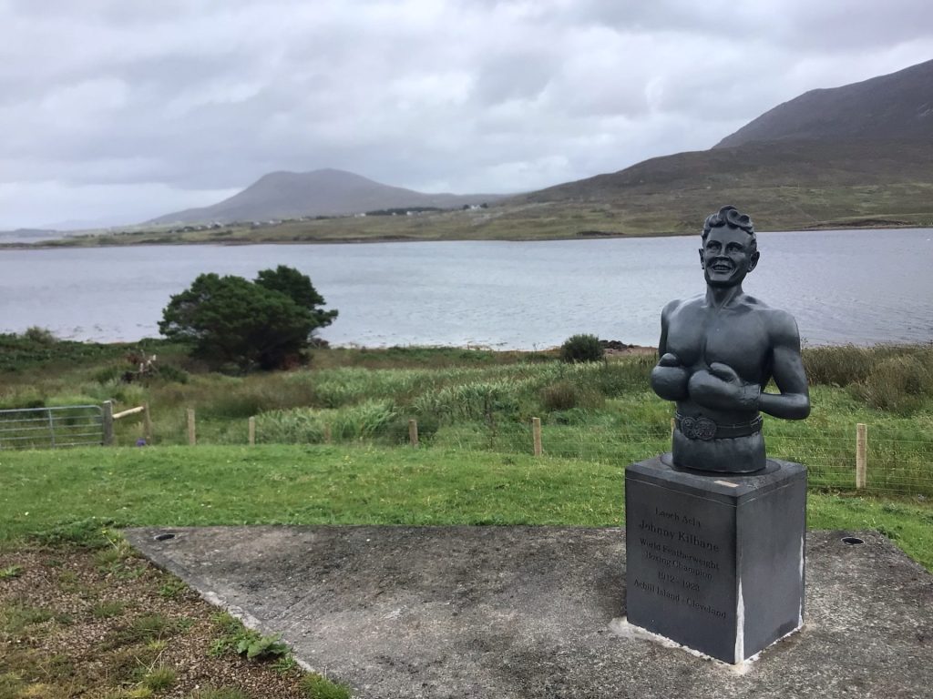 A 10h pétantes, je franchis le pont à l ‘entrée de Poll Rathnai. Ce pont relie le continent à cette presqu’île dont j’envisage faire le tour. Alors qu’un nouveau grain éclate, je trouve justement un café (grain de café évidemment !) pour m’abriter et en boire un. Par contre, pas de wifi. Je repars toujours sous un ciel menaçant à l’assaut de Achill Island. Il y a un siècle, un ancien champion du monde des welters était originaire de cette île.