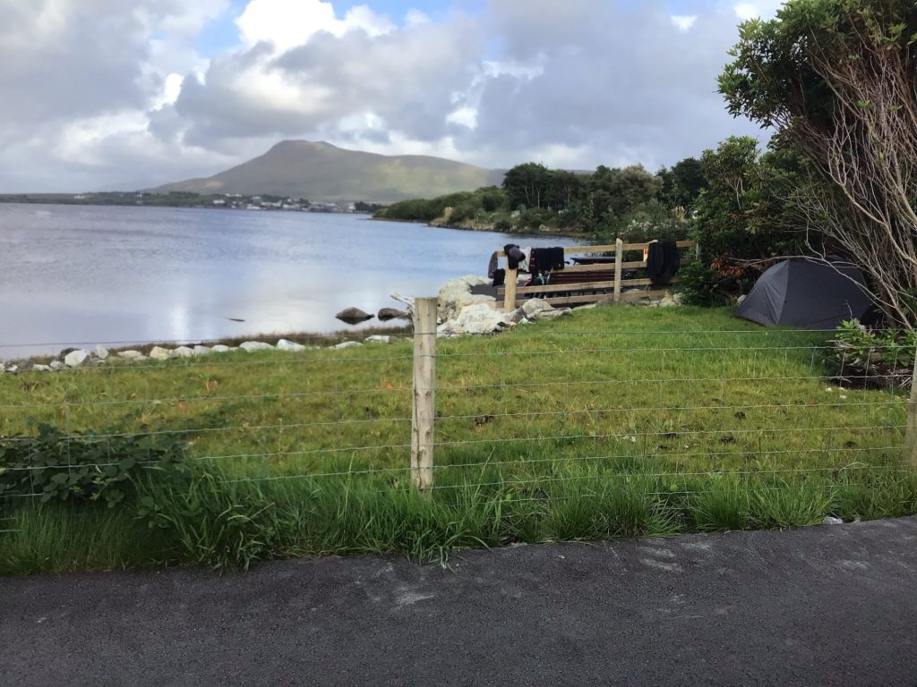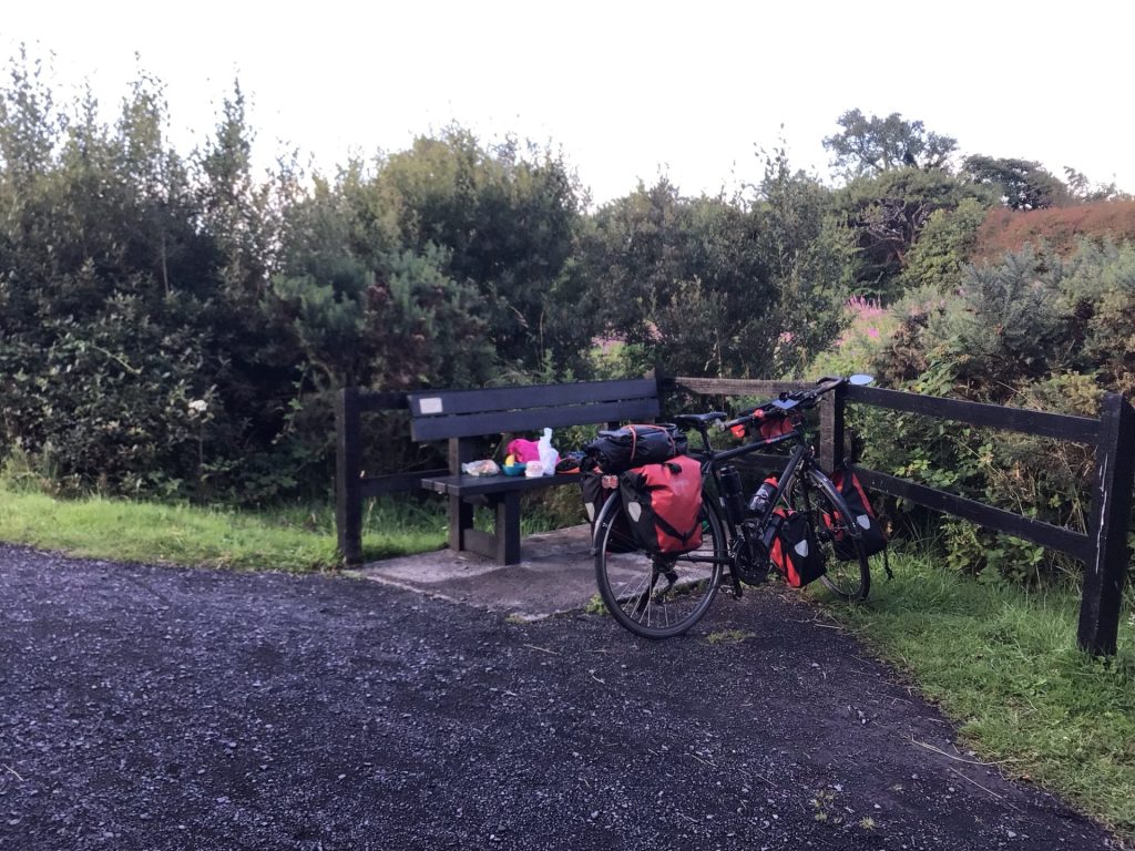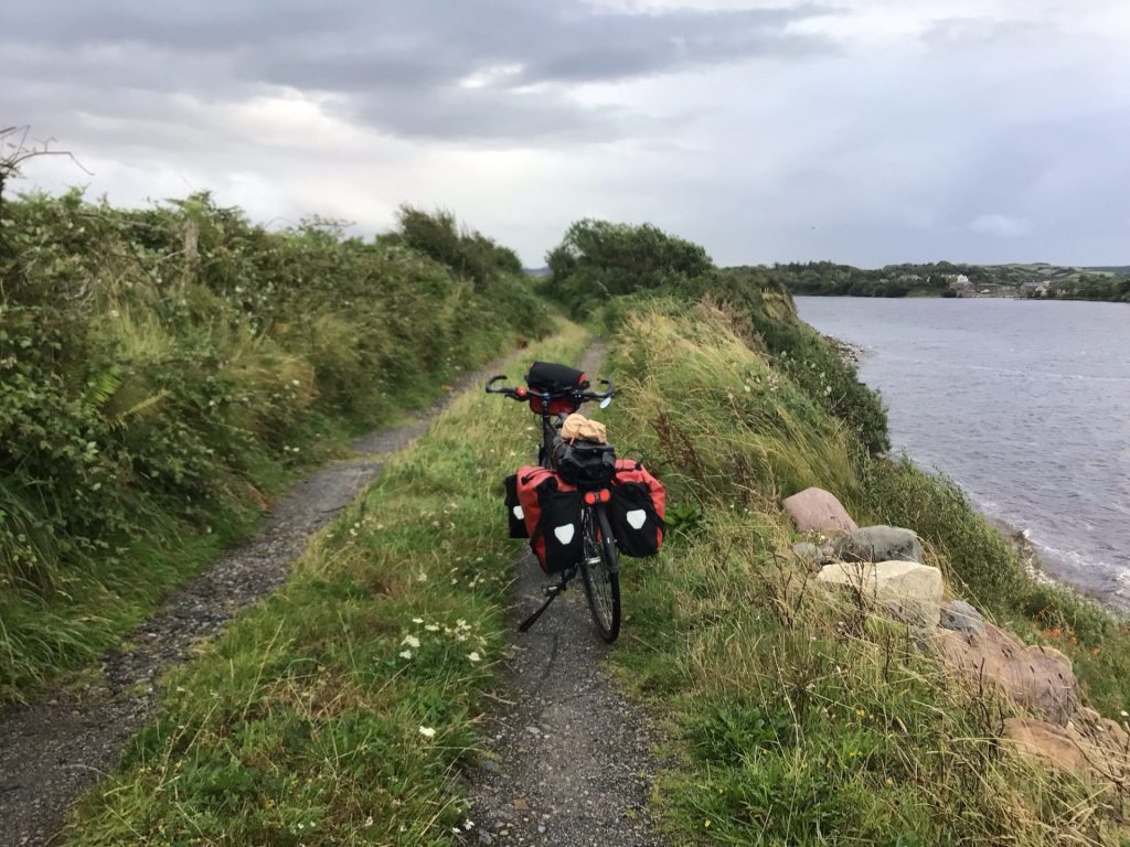 Il est 17h00. It’s Guinness Time ! Je m’arrête dans le pub Ted’s Bar où je voulais déjeuner ce midi. J’en profite aussi pour publier le blog d’hier, rédiger celui d’aujourd’hui, essayer de régler mon problème de remboursement d’avion pour Tbilissi et discuter avec un jeune couple de Dublin en vacances dans le coin. Il faut également que je me préoccupe de trouver un bivouac pour ce soir et aussi faire quelques courses. Je repars sur une piste cyclable m’évitant la R319 qui sort de l’île. Alors que j’avais prévu d’aller un peu plus loin, un espace avec table et pelouse avec un bel arbre m’abritant du vent m’invite à me poser. Parfait !