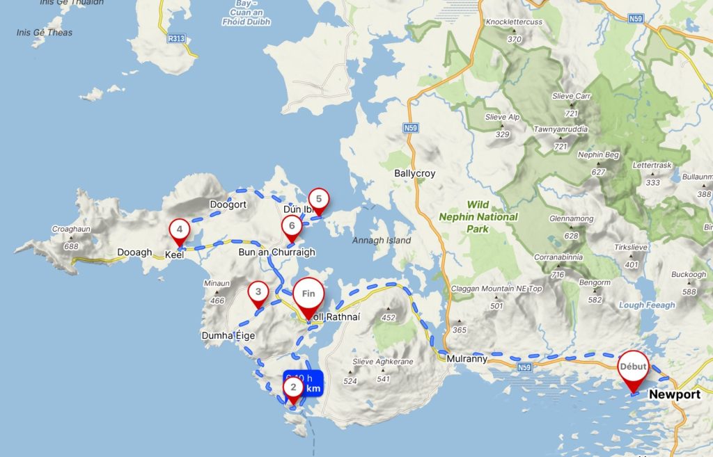 PS : au point 5, ma trace me faisait traverser la petite île avec 2 traversiers avant de rejoindre le continent au niveau de Ballycroy