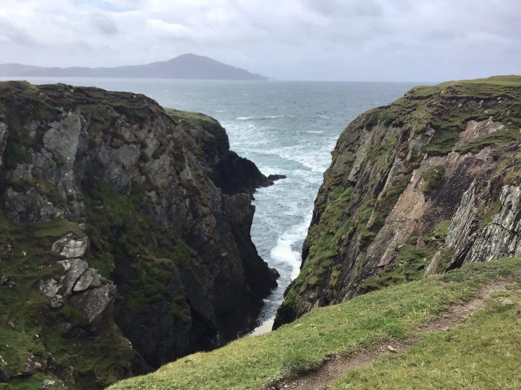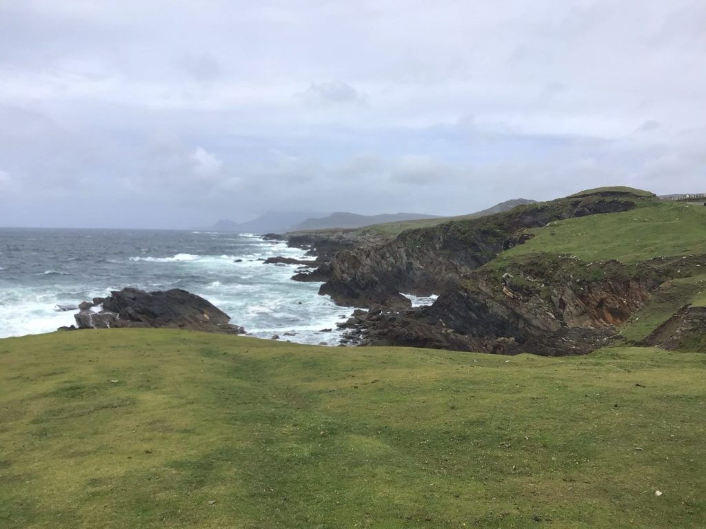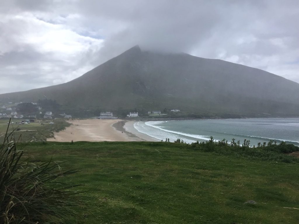 A 15h, je repars. Ma trace EV1 me fait monter au nord pour choper un hypothétique ferry qui me ferait gagner du temps en remonter vers Ballycroy sur le continent. C’est bizarre. J’ai un doute. On verra bien. Je me retrouve la côte sous le vent. L’impressionnant Slievemore, culminant à 671 mètres, accrochent les nuages. Un léger crachin arrose la belle plage de sable fin.