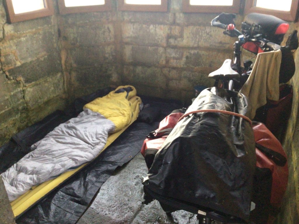 En redescendant vers mon vélo, je repère un abri en pierre construit pas très loin de cette falaise. Je vais jeter un œil. C’est ouvert. Il y a une pièce avec une cheminée. C’est un peu crade mais, en faisant le ménage, ce sera vraiment parfait pour ce soir. De plus, un peu plus bas, il y a un incroyable tunnel où l’océan s’engouffre pour remonter, 100 mètres plus loin, dans un trou. Hallucinant ! On aperçoit mon abri de ce soir au fond.