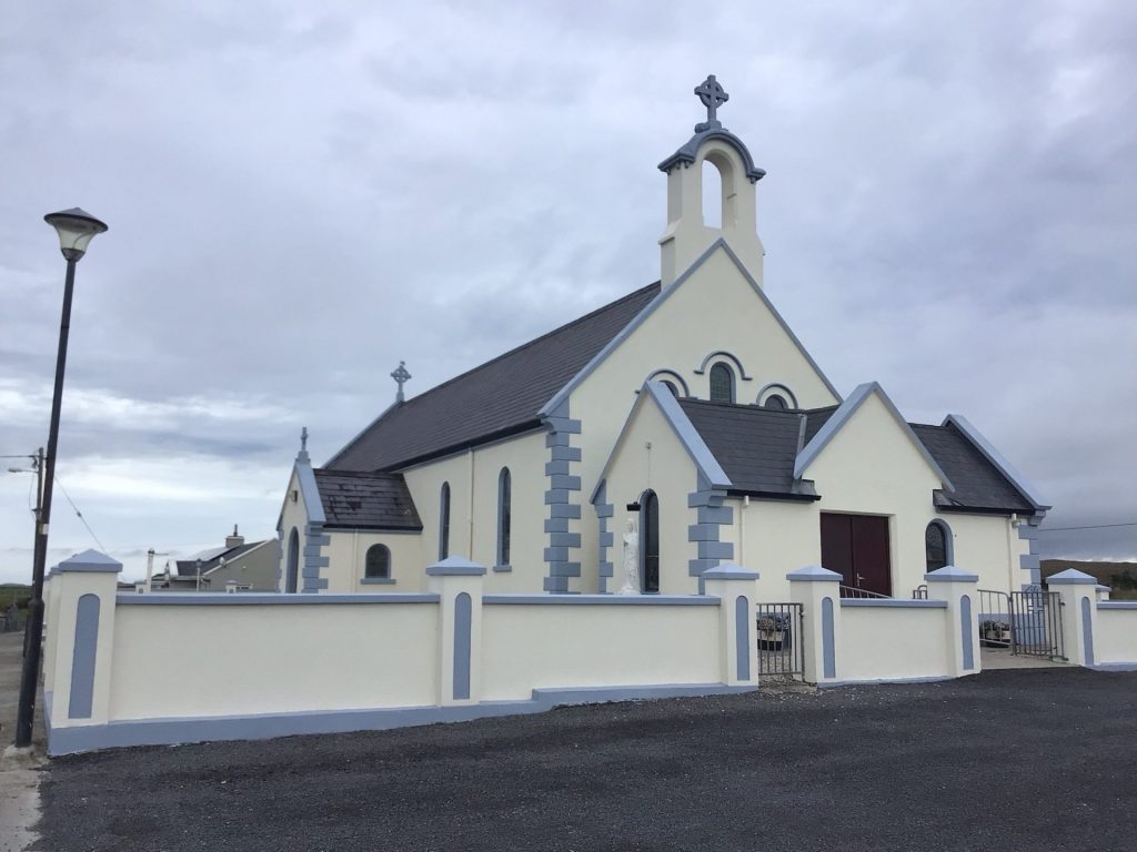 Vous remarquerez en bas sur ce panneau, la vague blanche sur fond bleu. Ce design permet de suivre la Wild Atlantic Way (North or South). Si, un jour, vous venez en Irlande en véhicule, je vous conseille de suivre cet itinéraire. Une partie de l’itinéraire EV1 (panneau du bas) l’emprunte également. Je me retrouve à nouveau seul au monde. Je traverse un hameau. Un café est indiqué. Incroyable. Je m’y rends et y suis fort bien accueilli. D’ailleurs, ce doit être The place to be. Tous les gens du hameau doivent venir ici se retrouver. Ce café-restaurant se trouve juste derrière la charmante église. Hélas, je trouve que la plupart assez récentes sont assez moches.