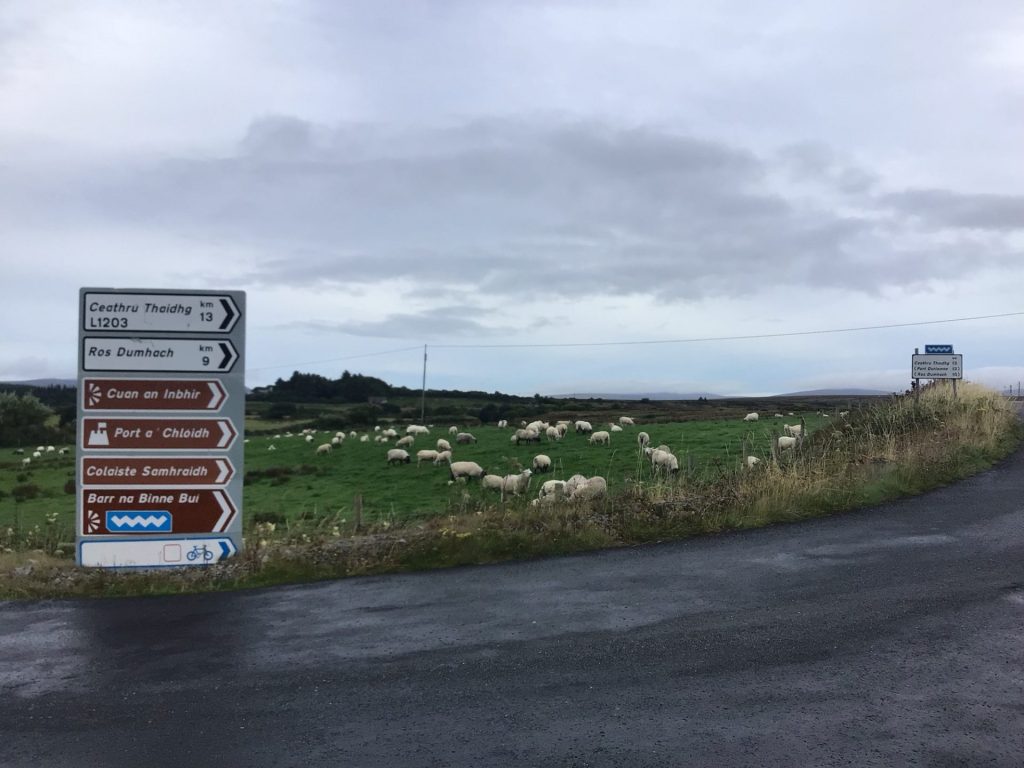 Alors que j’emprunte un bout de régionale coupant à travers la péninsule, je bifurque à gauche pour suivre mon itinéraire vélo. Dorénavant, les panneaux sont tous en gaélique. Je me rapproche de l’Irlande du Nord protestante rattachée à l’Angleterre honnie. L’anglais ne doit pas être le bienvenu ici !