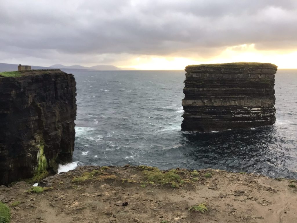 La bruine est toujours présente. Je vais devoir un plan B pour ce soir. « Tout se fera » isn’t it ? Alors que la route longe la côte à l’intérieur des terres, un panneau indique « Saint Patrick Head ». Je pense que c’est la pointe avec un rocher, détaché de la falaise, aperçu au loin. Je bifurque à gauche pour m’y rendre. Je laisse mon vélo sur le parking où une vingtaine de véhicules sont stationnés. Et je grimpe à pied en haut de la falaise. C’est bien cela.