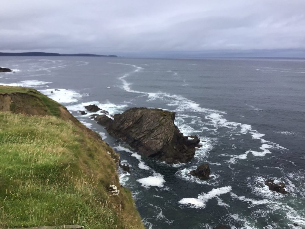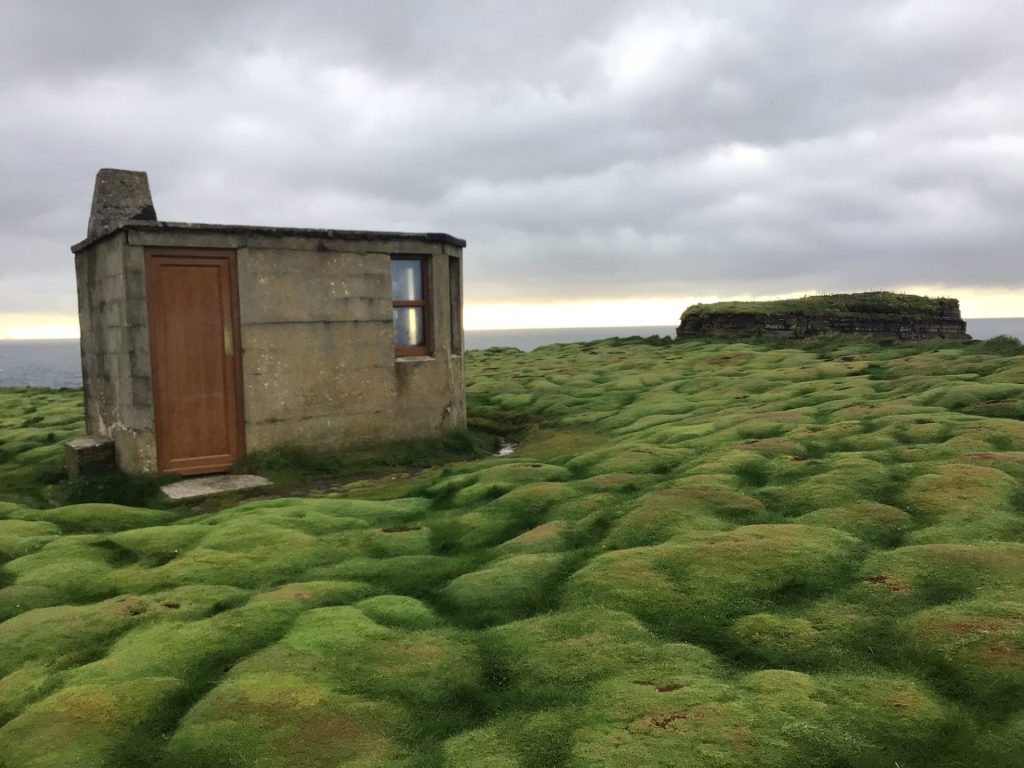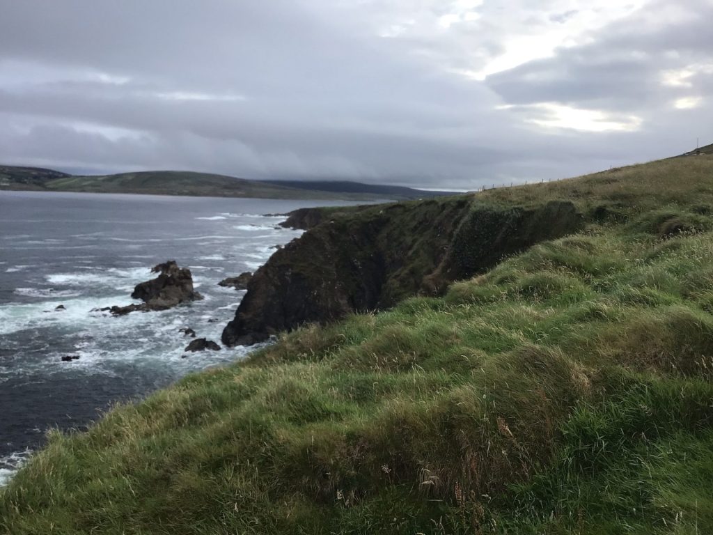 Vers 15h, alors que la météo annonce une accalmie, je reprends ma route vers BallyCastle. Il ne pleut plus … il bruine ! Mes vêtements sont légèrement humides (euphémisme). Cette côte est à nouveau magnifique avec ces falaises, ces prairies verdoyantes, cet océan et ces nuages aux nuances de gris …