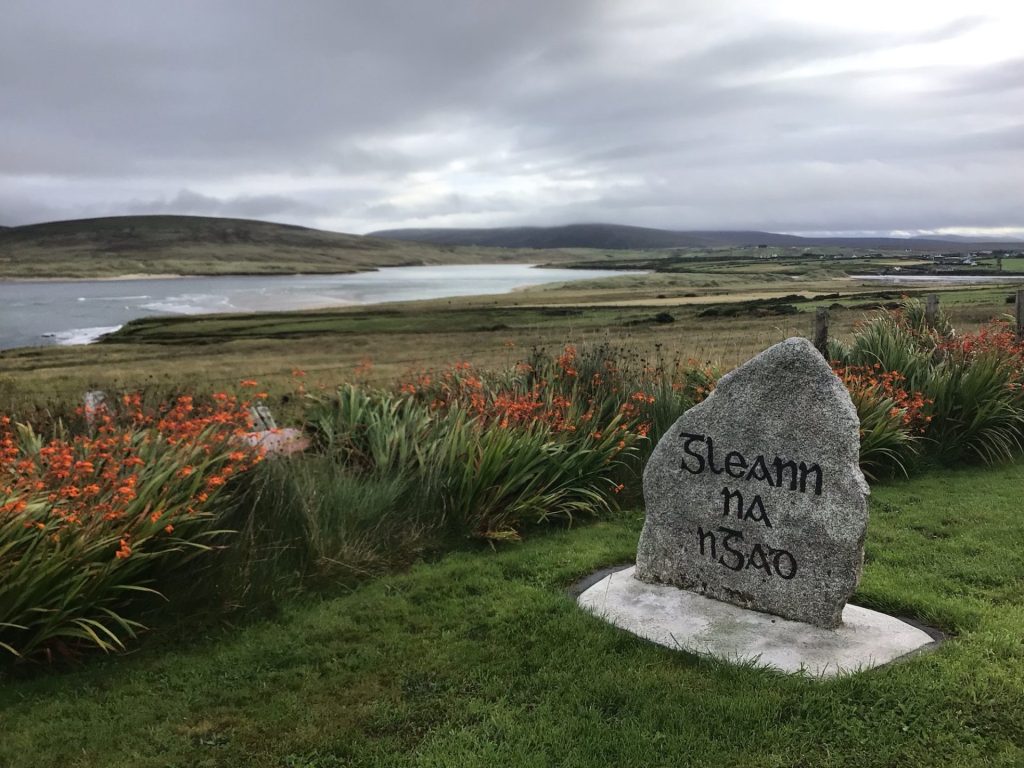 Peu après 8h, je quitte cet incroyable bivouac puis traverse le champ, pour le moins humide, en poussant HakaOne, avant de reprendre ma route. Je vais à nouveau contourner l’estuaire de cette baie avant de faire le tour du promontoire. Je longe mon premier hameau avec, comme dans tous les villages, ce bloc de granit et cette inscription en gaélique qui en marque l’entrée.