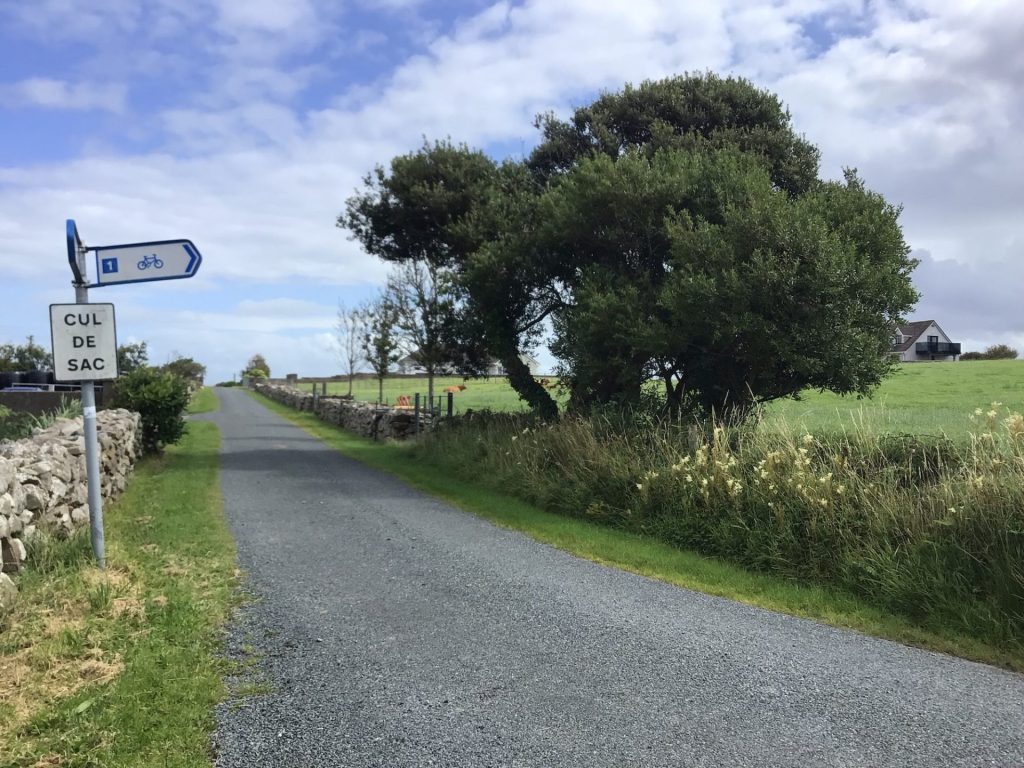 Par contre, de là, il me faut remonter en pente directe en haut de la colline. Je me fais doubler par un gars à vélo de course, au moins aussi âgé que moi (le gars pas le vélo !), qui m’encourage. Avec les sacoches, j’ai quand même du mal à l’accrocher. Une fois retombé sur l’EV1, je me dirige direct vers la pointe que j’ai ciblé pour ce soir. J’arrive au bout en faisant gaffe de bien respecter le panneau (même si c’est une bagnole !).