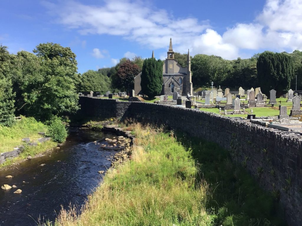 Puis je repars dans la paisible campagne irlandaise pour rejoindre Grange et traverser la Grange River et ce petit estuaire. Je passe devant l’ancienne école qui date de 1891. Elle a été joliment restaurée et magnifiquement fleurie. Malheureusement, je passe devant alors qu’un gros nuage masque le soleil. Pendant que j’y pense, je voulais aussi noter le fait que la plupart des écoles des bourgades et villages sont à l’extérieur du bourg. Et, souvent, l’arrêt des voitures est interdite devant. Seuls les bus ont le droit de stationner.