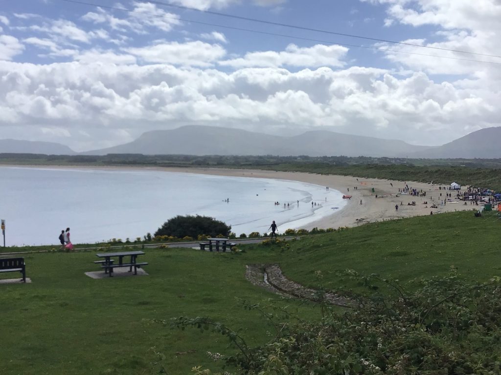 A nouveau, je suis seul au monde. Peu de voitures. Pas de village. Vers 11h, je reviens vers la côte et arrive dans la splendide et touristique cité balnéaire de Mullaghmore. La route pour aller à la plage est fermée tellement il y a de prétendants. Je contourne ce promontoire par la gauche après avoir aperçu au loin un magnifique château érigé sur la falaise.