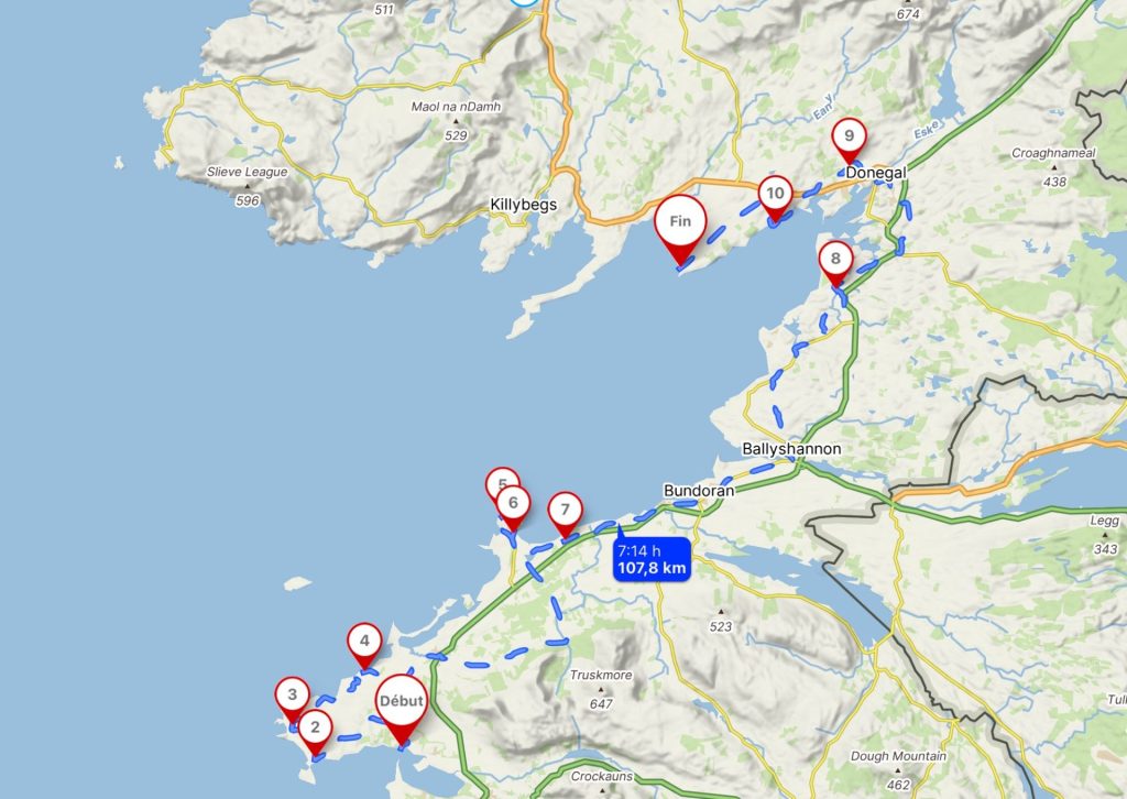 Puis, une fois mes affaires pliées, je pratique ma séance de Qi Gong devant la plage de galets. Avant de partir et avant que je n’oublie, je vais dédicacer cette journée à ma mère, 87 ans aujourd’hui et en mode survie dans son EHPAD lavallois. Peu avant 8h, je reprends la Wild Atlantic Way que suit également l’EV1. De temps en temps, ma trace revient vers l’océan. J’adore lorsque je retrouve ce spectacle. A nouveau, une ferme abandonnée domine les éléments. Quel dommage avec cette vue incroyable !