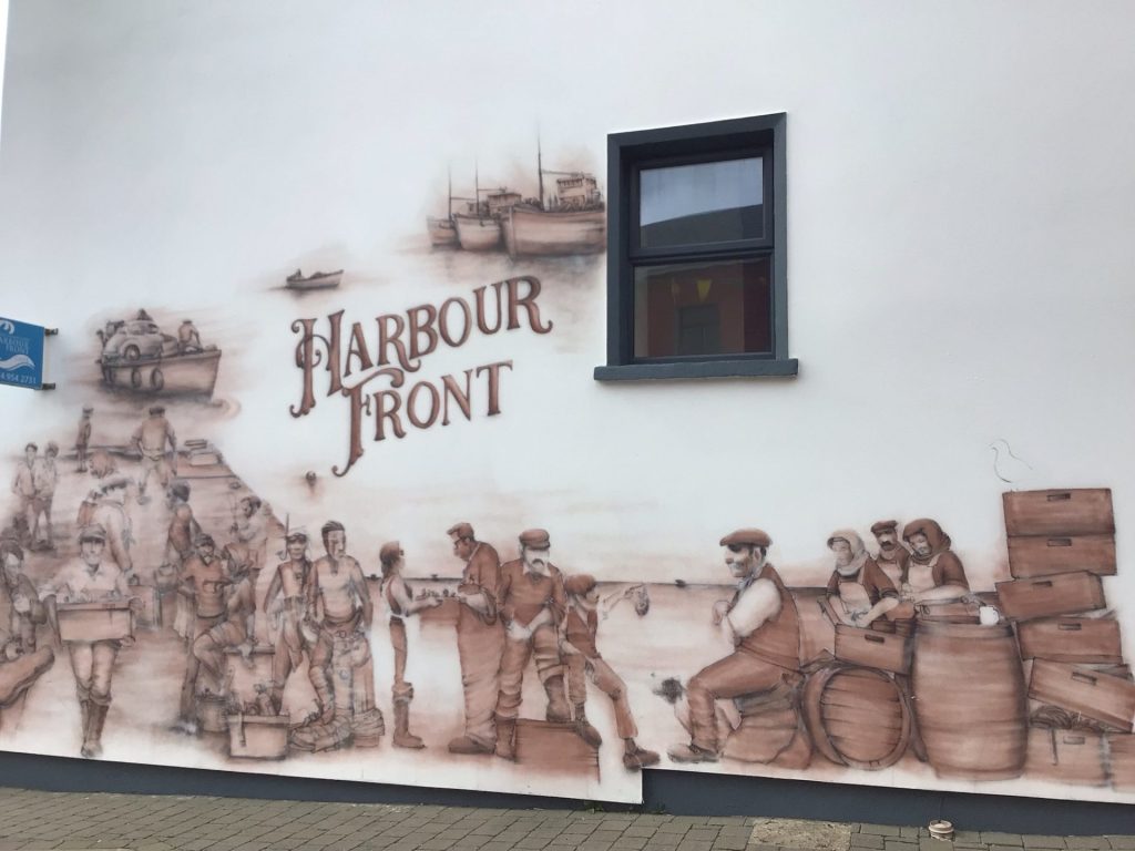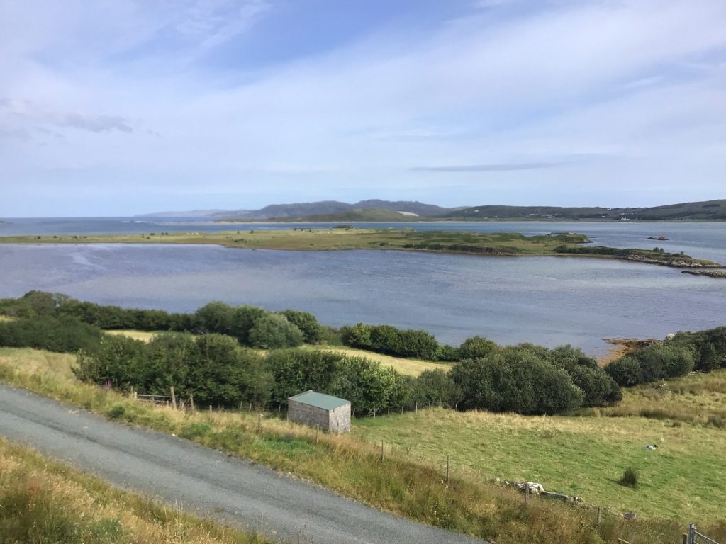 En sortant de ce hameau, une jeune fille se prépare, devant le camion de son père, à partir faire sa sortie vélo. Quant à moi, je file vers la ville de Dungloe (An Clochán Liath). Quelques kms plus loin, elle me double. Puis c’est au tour du papa qui appuie fort pour revenir sur sa fille. Il la rejoint. Je les vois s’éloigner. Arrivé en ville, je trouve un magasin ouvert pour faire mes courses quotidiennes. J’avais zappé que nous étions dimanche. Je prends ensuite la route régionale R259 qui suit la côte. J’arrive au petit port de Burtonport qui dessert l’île de Arrannmore (Àrainn Mhór). Un pub m’ouvre ses portes pour ma Guinness bien méritée après cette journée homérique. J’adore cette ambiance où les gars, assis sur des tabourets autour du bar, discutent avec la patronne. Comme souvent, l’un d’eux me demande d’où je suis, d’où je viens et où je vais. Et la conversation s’engage.