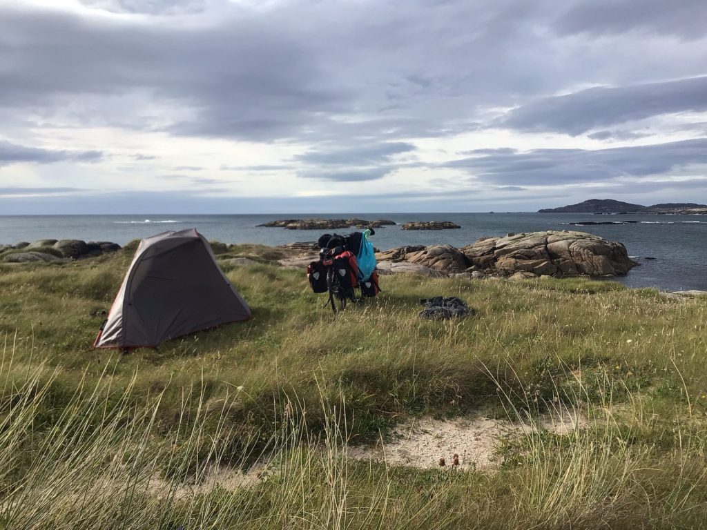 Par contre, il est 17h00. Il me faut repartir à la pêche au bivouac ! Je consulte ma carte et repère une pointe avec vue sur l’océan du côté de Cloughglass. Je positionne le point d’arrivée dessus et let’s go ! Arrivé sur site, il me faut ouvrir/fermer 2 barrières qui ferme un champ. Puis prendre un chemin piéton à travers les dunes en poussant HakaOne. Et ensuite trouver la plateforme pour accueillir ma tente. Encore une fois, c’est magique ! J’ai même ma plage privée au pied du bivouac.