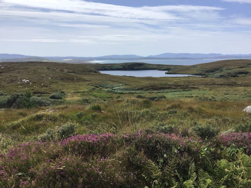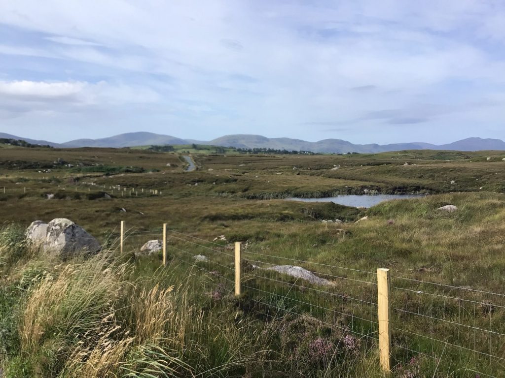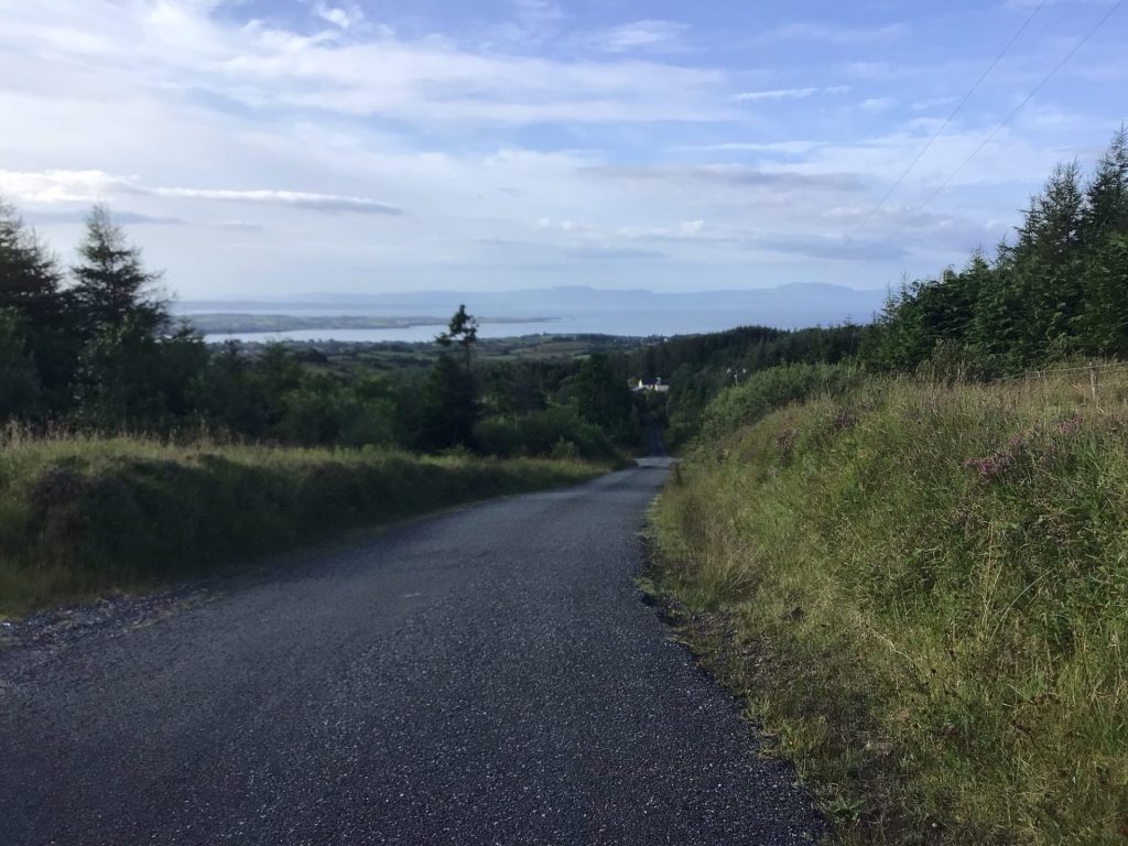Il est 9h30 quand je traverse ce village encore endormi. De toute façon, il est encore trop tôt pour mon breakfast irlandais. Je poursuis ma route en suivant l’EV1 qui me fait à nouveau couper à travers une autre pointe. C’est reparti pour de la grimpette ! Mais, contrairement aux décors boisés de la précédente, je retrouve ces paysages de landes perdues parsemées de laquets. Je me régale sur cette petite route vallonnée qui serpente dans cette nature sauvage.