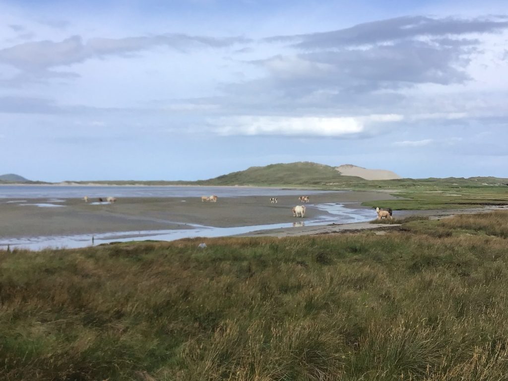 Un vieux paysan sur son antique tracteur surveille son troupeau au pied d’une magnifique dune de sables. Je passe ensuite devant la belle plage dont m’avait parlé mon joggeur. Ce spot doit être connu de quelques locaux. Seuls quelques voitures stationnent sur le petit parking. Des baigneurs profitent du beau temps devant le regard impassible des ruminants.