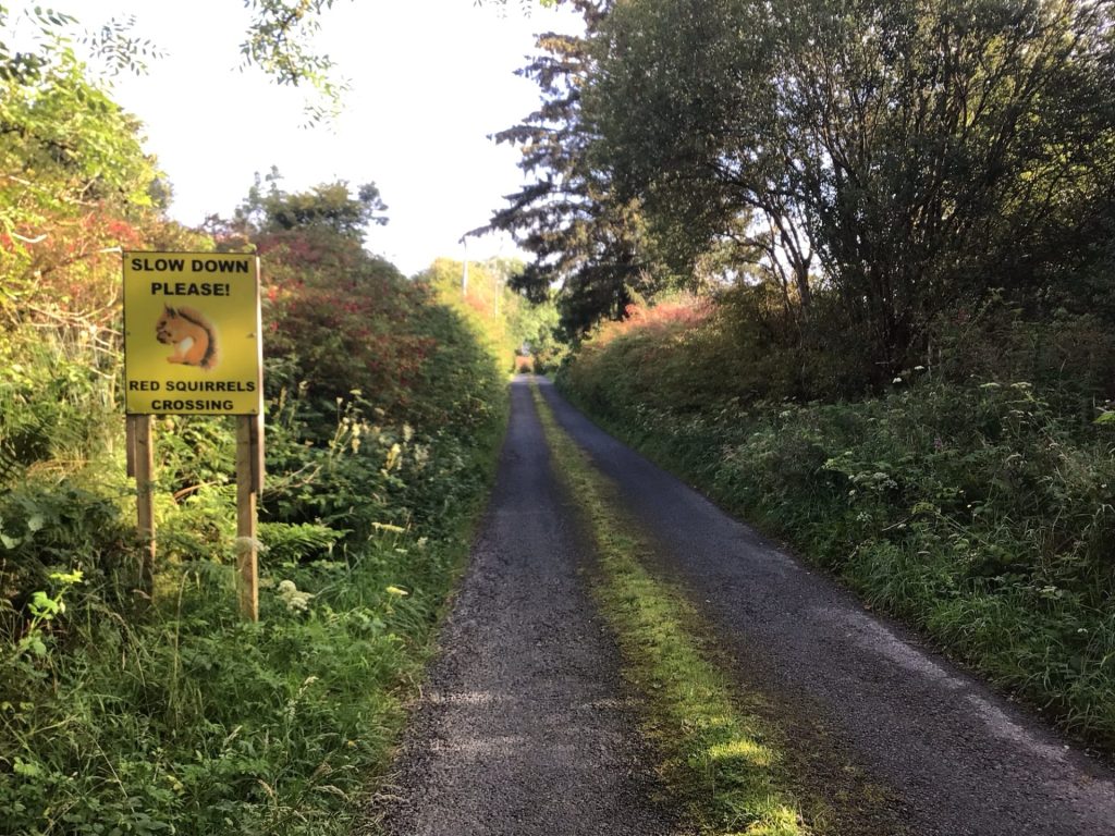 En ce dimanche matin, je ne croise à nouveau pas grand monde si ce n’est une marcheuse matinale avec son chien. Je continue à grimper sur ce massif dont le sommet culmine à 529 mètres. J’essaie de respecter la signalisation afin de ne pas écraser un malheureux écureuil rouge. Une centaine de mètres en-dessous, un autre panneau signalait la mort de l’un d’eux écrasé par un automobiliste.