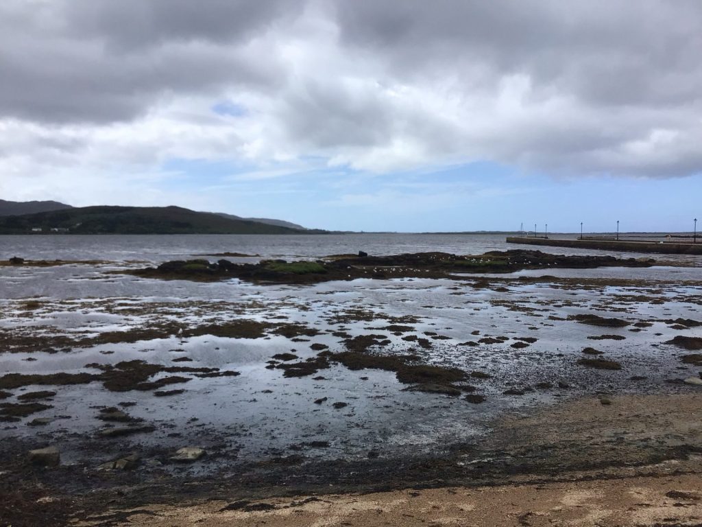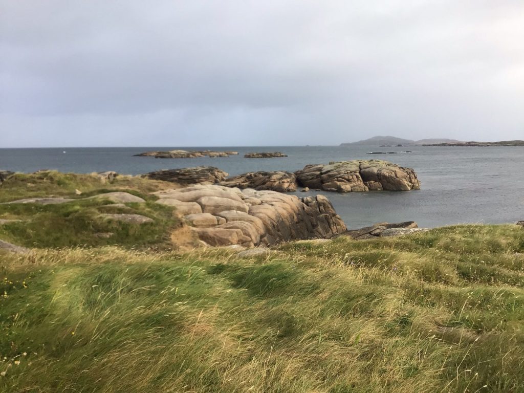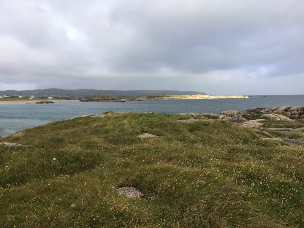 Alors qu’il commence à poindre, le vent tourne et souffle alors violemment plein ouest. De ce fait, la tente se trouve avec le vent de côté. Pas bon ça. Elle plie mais ne rompt pas. La pluie n’a pas cessé. J’ai peur que l’arceau de carbone maintenant la structure ne finisse par péter. Pour le soulager, je décide de faire une partie de jambes en l’air !Je m’allonge sur le dos et tend une jambe avec le pied en appui pour faire un renfort. Lorsque je commence à fatiguer, je change la jambe. Le temps me paraît interminable. Mes chaussettes et mes pieds sont trempés et gelés. Vers 7h30, la pluie cesse enfin. Par contre, le vent, lui, souffle toujours fort. Tant pis. Je sors et plie le bivouac le plus rapidement possible. J’enfourne tente, duvet et matelas gonflable dans leurs sacs respectifs. Je me dépêche vu que de gros nuages noirs arrivent plein ouest (photo du haut). Il est temps de vite partir de cette pointe et de rejoindre Dungloe à 10 kms d’ici plus au sud.