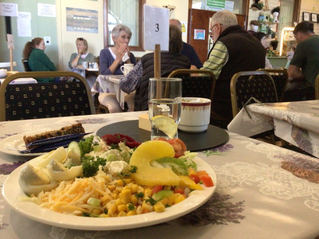 En descendant la rue principale, je croise deux cyclotouristes allemandes en mode Gravel. Je fais demi-tour pour aller taper la causette. Elles sont à la recherche d’un vélociste. En effet, l’une d’elles rencontre un problème sur sa roue arrière qui bouge (enfin, c’est ce que je comprends). Je leur propose de jeter un œil. Je vire les sacoches et fais tourner sa roue qui est effectivement bien voilée. Après inspection, il s’avère qu’elle a sa jante qui est en train d’éclater au niveau d’un rayon. Elle est en train de faire une Nico (cf blog Thaïlande 2023). Décidément, c’est la spoke story ! Je les aide à trouver un magasin de vélo à quelques kms d’ici et les abandonne. Il est 14h. Je trouve un café sympa dans l’ancienne église du village reconvertie en Office de Tourisme. Je me prends une belle salade végé et attends la fermeture à 15h pour me rendre à ma chambre.