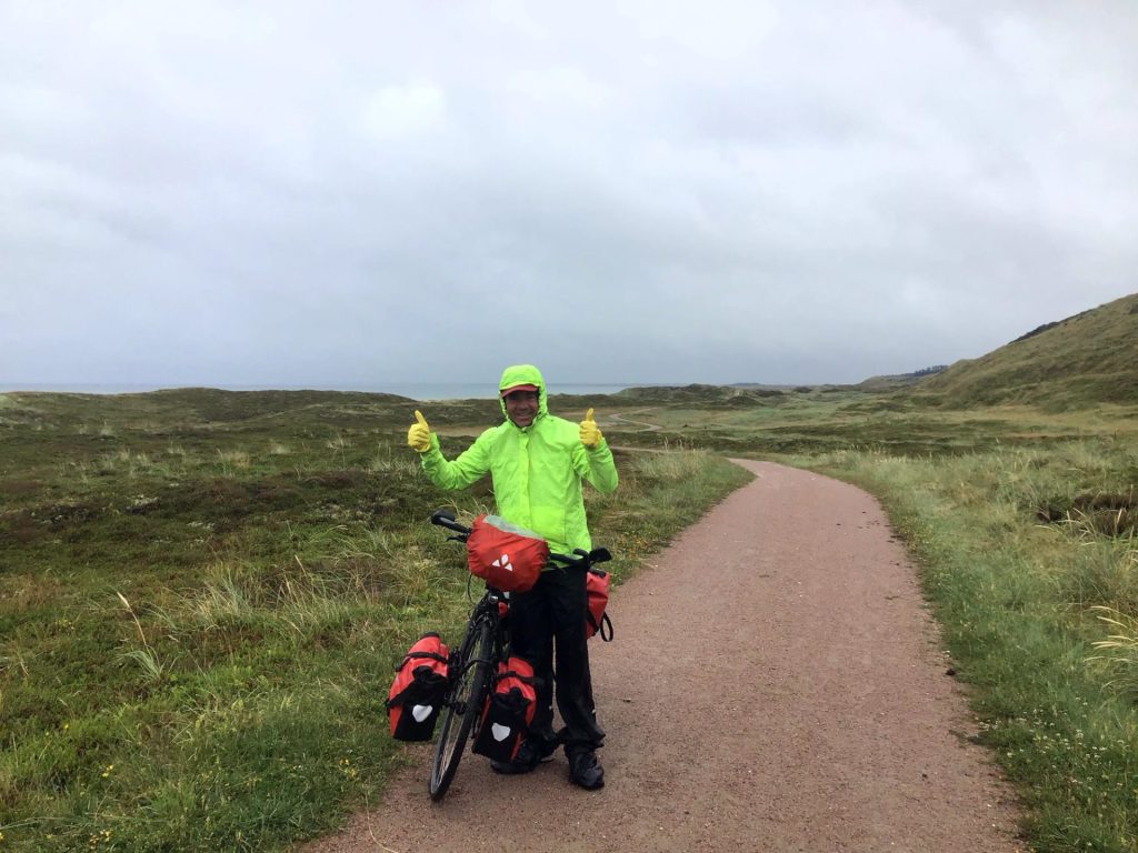 Après avoir traversé les dunes de sable, je rejoins le parking de la plage et me prends le vent plein fer pour retrouver la civilisation. Il est 9h00 quand j’entre dans le premier café ouvert. Je profite des toilettes pour me changer. Puis je dévore un F.I.B accompagné d’un américano suivi d’un AméricanoScone ! A ma sortie, les voisins du café doivent se demander quel est ce personnage bizarre en short de plage, tee-shirt et claquettes qui se baladent par ce temps à vélo !