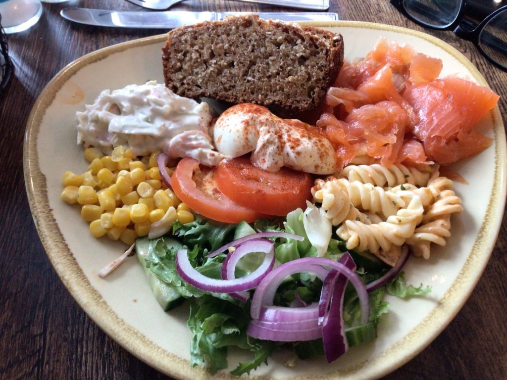 Je redescends toujours en empruntant de petites routes pour éviter la N56 qui longe la mer. J’évite ainsi la ville de Dunfanaghy planquée au fond de son estuaire. Par contre, je passe dans le village de Creeslough. Il est déjà 14h00 bien sonné. Je m’arrête dans le Coffee Shop Huckleberry pour y manger une belle salade de saumon suivi d’un espresso-brownie chaud. Cela devrait tenir jusqu’à ce soir.