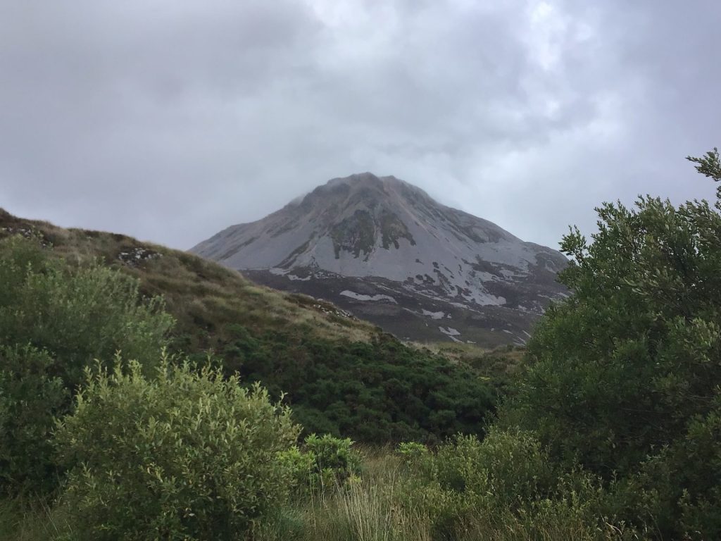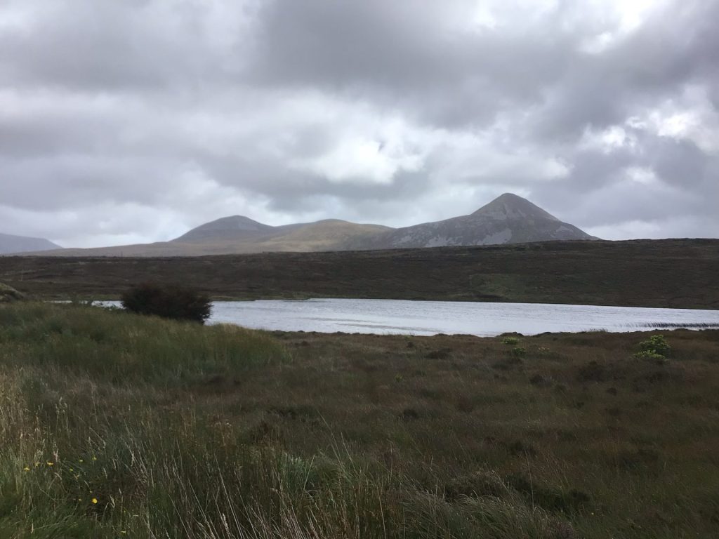 Vers 11h, je m’arrête dans le hameau de Dunlewy au pied du lac Dunlewey et de ce dôme pour y boire mon café dans la station-service-commerce du coin. Comme dans beaucoup de supermarchés, une machine est en libre-service. A côté, un certain nombre de gâteaux sont également proposés à la vente. Vous vous servez et vous consommez. Ensuite vous allez à la caisse pour régler ce que vous avez consommé. La confiance est totale. Ces gens du Nord ont vraiment une autre mentalité … Je reprends la route en contournant ce massif. Ça grimpe sec. Une trouée me permet d’apercevoir son sommet avant que les nuages ne l’envahissent à nouveau.