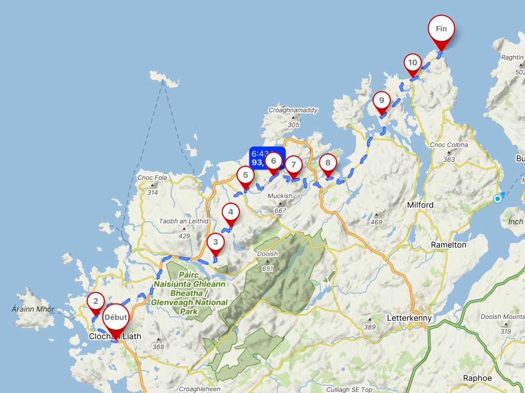 Après cette superbe mise en jambe, je retrouve la N56 à Croithli. Cela devient de suite beaucoup moins sympathique. Je suis obligé de l’emprunter pendant quelques kms en suivant la Clady River. Heureusement, je bifurque ensuite sur la route R251 qui longe le lac Nacough. J’arrive au pied de l’impressionnant mont An Earagail qui culmine à 741 mètres. Dommage, sa tête est prise dans les nuages.