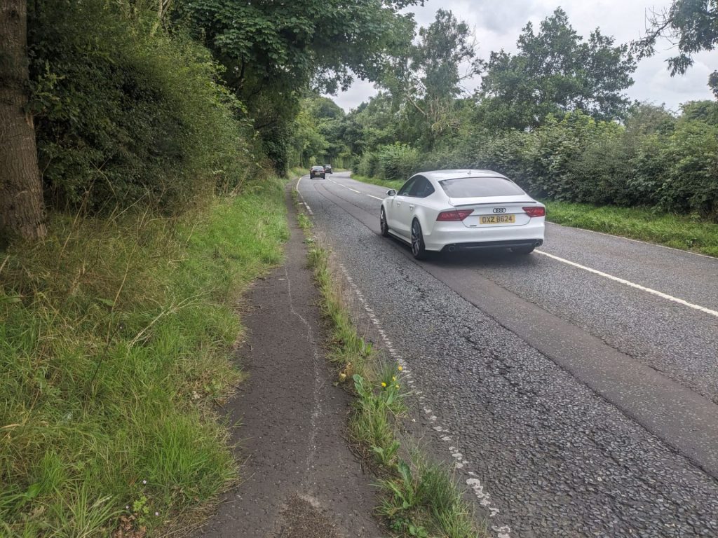 J’ai bien fait de tout plier alors que le vent avait séché tente et bâche. En effet, quand je sors de la cuisine, il bruine. Je pars avec mon coupe-vent. On verra. Il me faut remonter une belle pente avant de retrouver la route A2 appelée Causeway Coastal Road. A froid, ça tire sur les gambettes ! Je longe des landes désertes du côté et de grandes forêts de pins de l’autre.