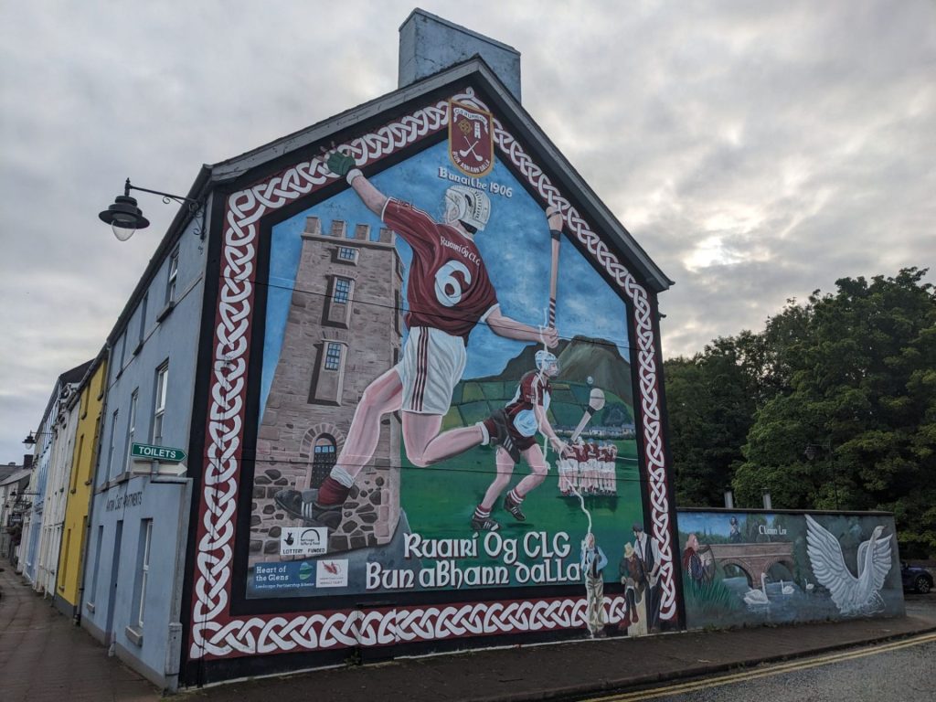 J’en profite pour immortaliser cette fresque murale avec un joueur de hurling d’un côté et de lyre de l’autre.