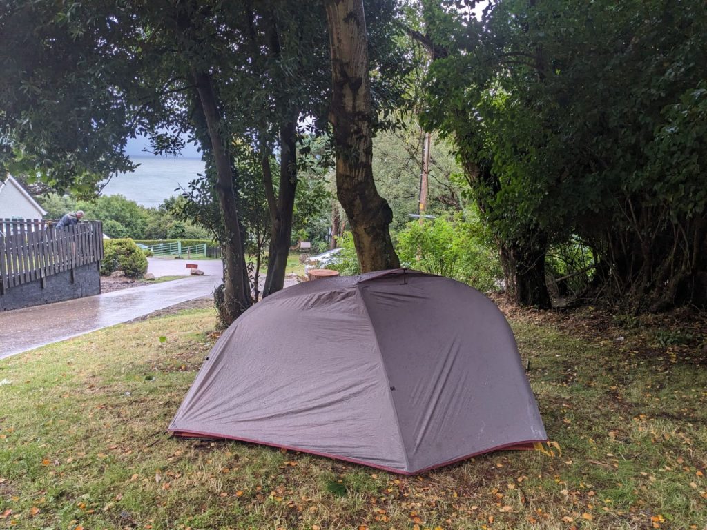La pluie a cessé. Je m’arrête. Le camping a l’air sympa. Je monte me renseigner. 15€ la nuit avec un emplacement sous les arbres et vue sur mer. Je décide de me poser. J’appelle le B&B pour les avertir et m’installe. L’emplacement et les gérants sont sympas mais le camping quelque peu rudimentaire. En effet, il n’y a pas d’espace commun, ni de coin cuisine, ni de wifi bien-sûr. De plus, comme je n’ai pas fait de courses et que je ne vais pas retourner en ville, je demande aux gérants s’ils peuvent me vendre une bière, récompense de ma journée d’effort. Ils m’offrent une Budweiser et une Coors. Cool !