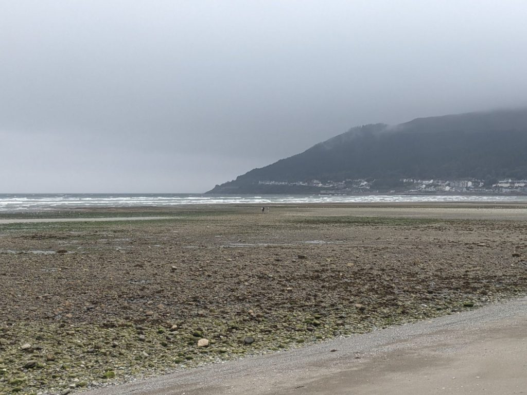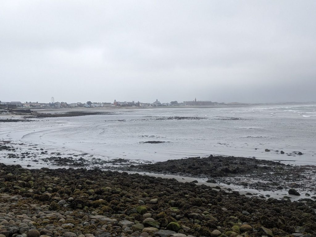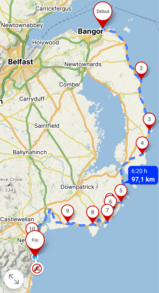 Cependant, sur Newcastle où je pensais m’arrêter, c’est à nouveau hors de prix : 119€ la moins chère. Je trouve finalement une chambre à Annalong, 13 kms plus au sud, au même tarif que avant hier (60€). Je réserve. Vers 16h, j’arrive enfin à Newcastle. La pluie s’est calmée mais le vent souffle fort soulevant des vagues. J’avance péniblement à 8km/h sur le front de mer … ce qui amuse beaucoup les autochtones en tee-shirt évidemment.