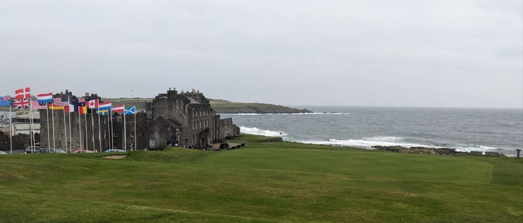 En sortant du village, je passe devant le plus vieux club house de golf du monde qui date du XVè siècle. Je continue ma descente vers le sud. Par contre, la bruine commence à tomber. Ou peut-être des embruns avec ce vent qui agite l’océan. Je porte toujours mon coupe-vent. Mais il est de plus en plus mouillé. Et, d’un seul coup, c’est le déluge. Ce ne sont plus des embruns mais des parpaings qui me tombent dessus.