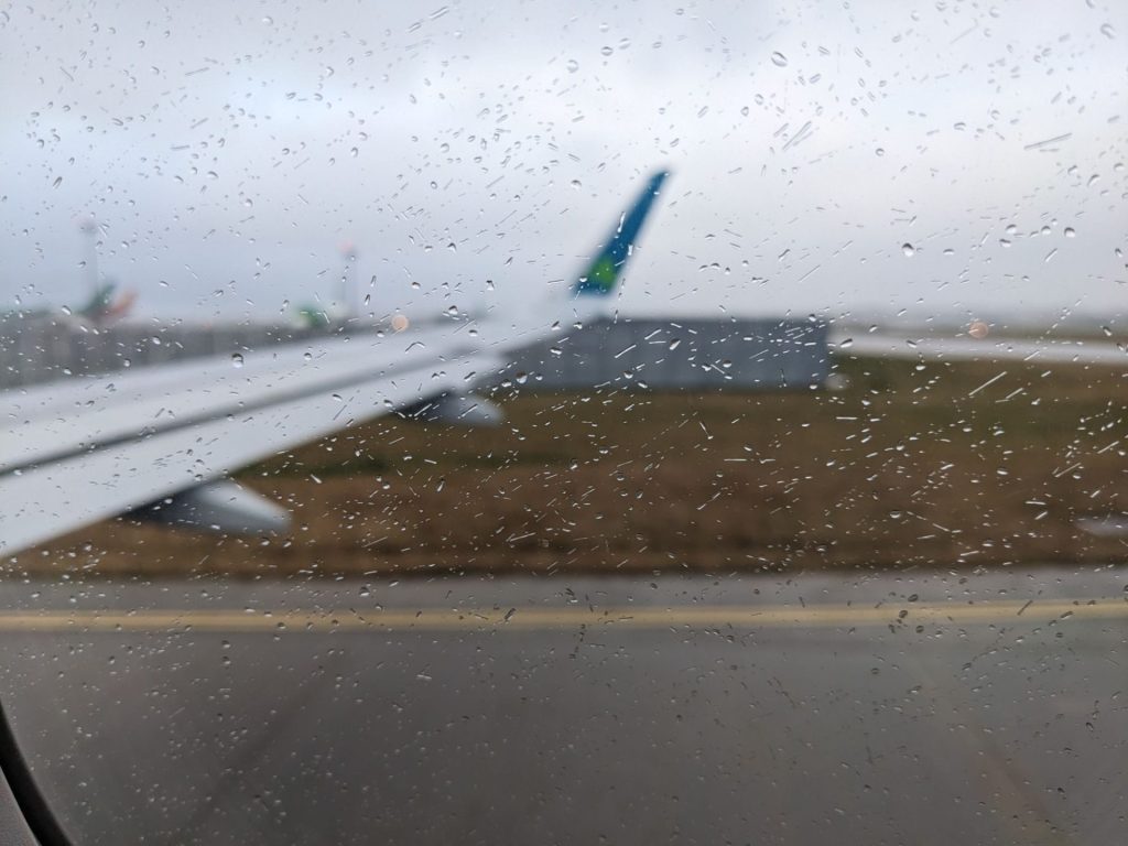 J’entends du bruit autour de moi. J’ouvre un oeil. Il y a pas mal de monde. Bizarre. Je regarde mon portable : 5h43 !!! O putaing cong !!! Ça va être chaud patate. Je prends la chariotte et me dirige fissa vers l’enregistrement. Heureusement, il n’y a pas foule. Je m’enregistre et file, avec ma chariotte, aux bagages XXL. Personne n’attend. Je dépose tout et file aux contrôles. Ça passe relativement vite. Pas de mauvaise surprise. Il est 6h35. Il me reste 5′ avant la fin de l’embarquement. Porte 46. C’est à l’autre bout évidemment. J’accélère le pas. Tout se fera. J’arrive 2′ avant. Je suis le dernier. Mais je passe. Pfffff …. Le ciel est , comme d’hab’, gris et couvert.