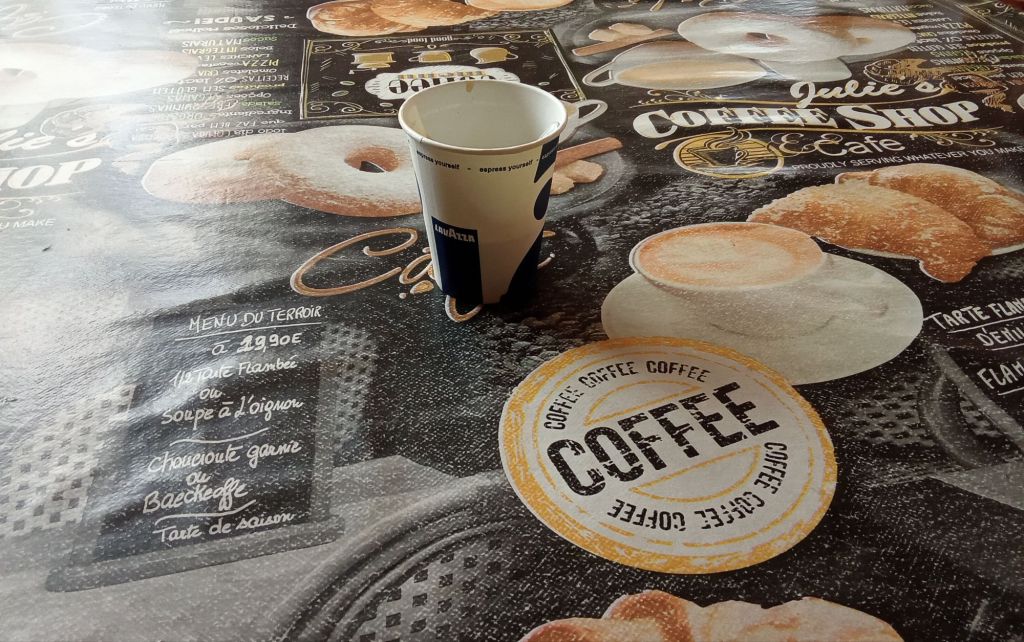 Un des deux paysans présents me propose un café à la machine. J’accepte fort volontiers. Pour le déguster, je m’installe à une des trois tables disponibles avec une nappe … alsacienne. Incroyable !