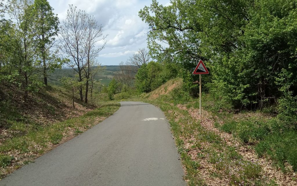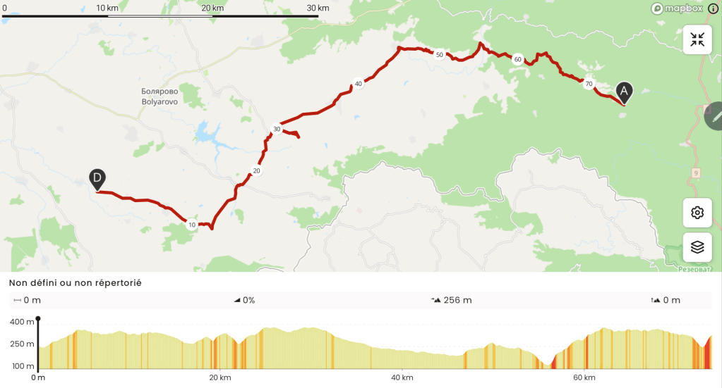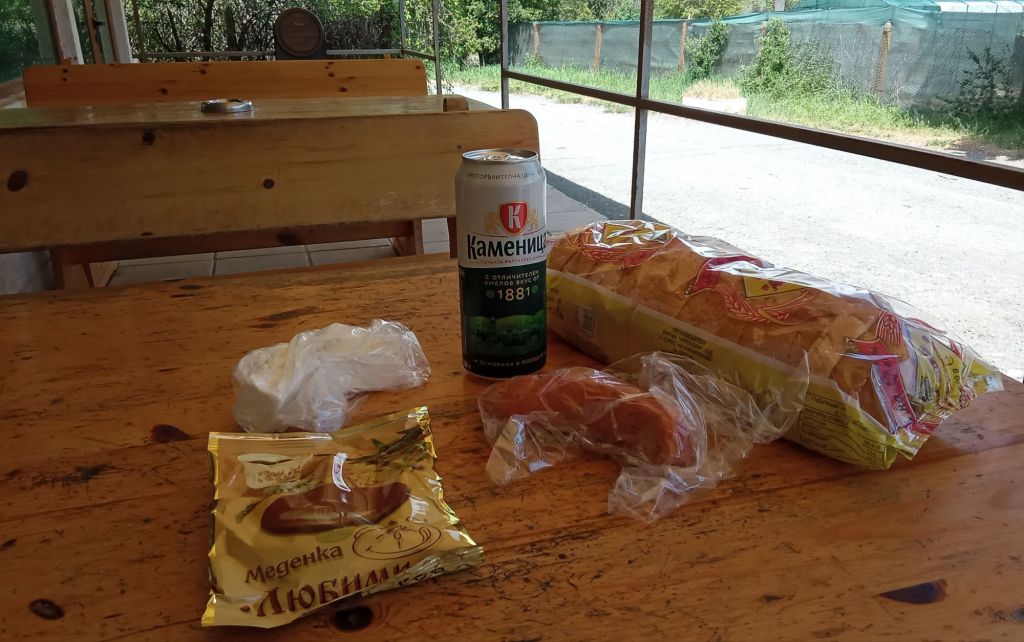 Peu après 13h30, après une belle descente sur une piste forestière, j’arrive dans le village de Golyamo Bukovo. Comme tous les autres villages, l’ambiance est lugubre. Cependant, je passe devant un commerce de bouche. Je m’y arrête et négocie avec la patronne le fait de pouvoir payer en euros sonnants et trébuchants. Je fais quelques emplettes et m’installe pour dévorer un morceau de saucisson et de la feta maison avec du pain sous cellophane, le tout accompagné d’une bonne bière. Dieu que c’est bon !