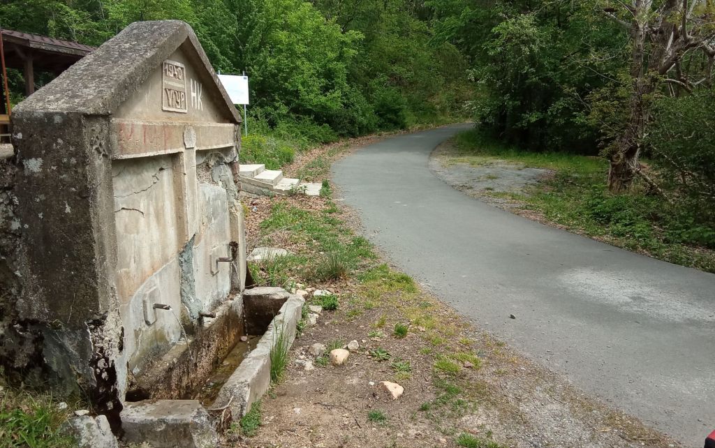 Arrivé presqu’au sommet de cette colline, je tombe sur une fontaine. J’en profite pour remplir mes trois gourdes. On se sait jamais. Peu après, la route bitumée se termine devant l’entrée d’un monastère. Deux molosses en gardent l’accès. Je ne m’y aventure pas. La route se transforme alors en piste forestière au départ de pins puis après de magnifiques chênes. Je me régale malgré la difficulté du parcours.