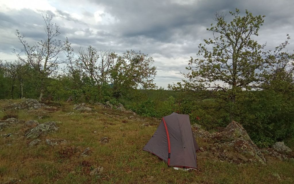 Il est 16h30. Je me hâte de monter le bivouac. Le ciel gronde méchamment. A peine ai-je le temps de me foutre à poil pour profiter des premières gouttes et faire ma toilette de chat que le déluge s’abat. Je me sèche vite fait et me couche à poil dans mon duvet. Ça souffle, ça gronde, ça secoue … J’ai l’impression de revivre ma tempête irlandaise. Bon, j’arrive quand même à m’endormir dans ce tumulte. J’émerge vers 19h. L’orage est terminé. Le soleil a refait son apparition. Je peux enfin sortir de ma tente pour terminer cette magnifique mais ô combien éprouvante journée. Certainement une de mes plus rudes depuis que j’arpente l’Europe à vélo.