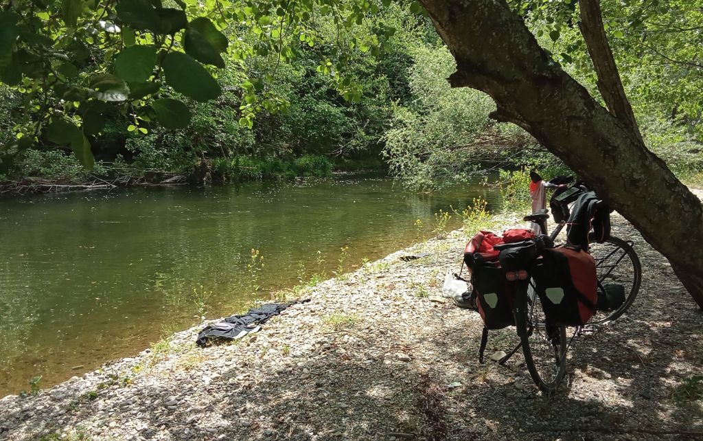 Mais, comme midi a sonné, je trouve une sente qui m’emmène au bord de cette rivière. Je vais pouvoir faire un peu de lessive, me baigner (pas longtemps, l’eau est plutôt frisquette), rédiger ces lignes, exposer mon panneau solaire, casser la croûte et faire une bonne sieste avant la dernière partie de cette journée. Je ne sais encore si je prendrais la route directe ou si je continuerais sur ma trace TC en bourdure de rivière jusqu’à Ahtopol un peu plus au sud.