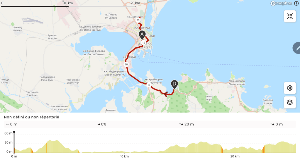 J’en profite pour réserver un Airbnb à Burgas. Je décolle en fin de matinée alors qu’une pluie fine rafraichit salmenet l’atmosphère. Il fait 11°C. Par rapport aux jours précédents, le changement est brutal. J’ai d’ailleurs ressorti mes jambières et mon ciré jaune. Je retrouve ma mauvaise piste qui longe la route 99.
