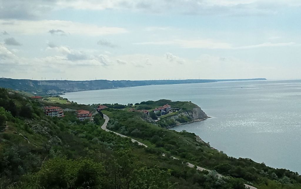 Je n’ai plus qu’à redescendre. Las, l’entrée du monastère est payant mais il n’ouvre qu’à 9h00. Tant pis. Ce sera dans une autre vie. Je descends à nouveau pour retrouver la route 9. Des complexes hôteliers et thermaux occupent la côte. La circulation y est intense mais dans le sens vers Varna. A la sortie de Kranevo, je m’arrête déjeuner. Il y a foule devant la petite boulangerie. Je continue ma route vallonnée avec un fort vent du nord bien frisquet. Peu après, je bifurque à droite pour suivre une superbe route longeant la côte. Au sud, le complexe de Bleu Lagoon …